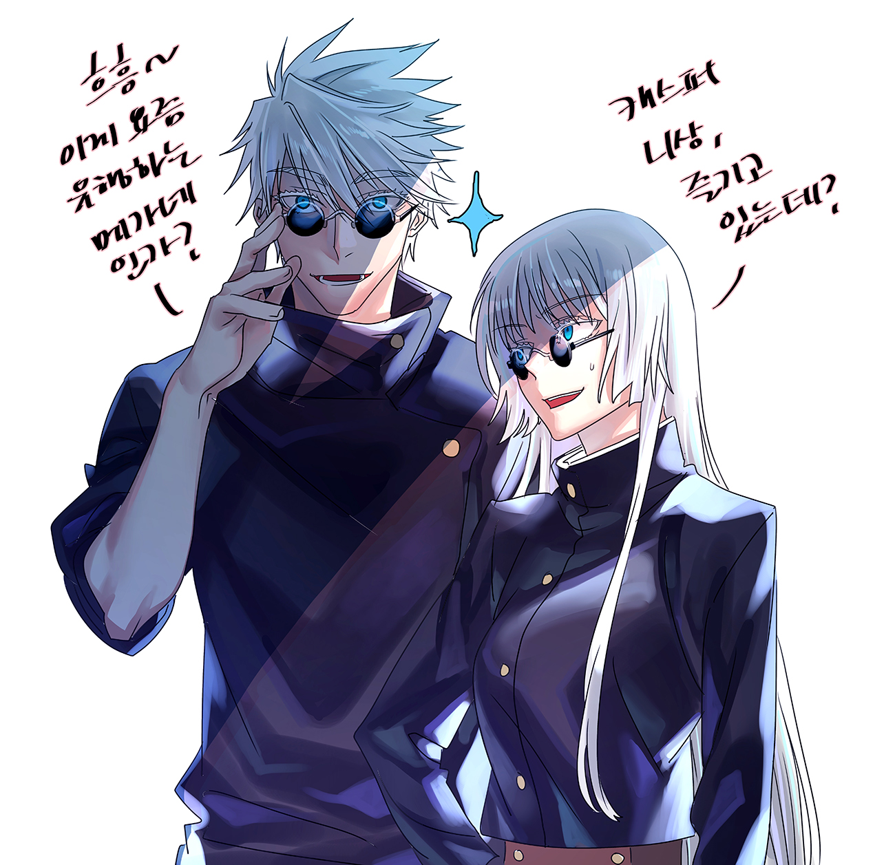 1boy 1girl aneunyeoja blue_eyes blue_jacket brother_and_sister colored_eyelashes cosplay gojo_satoru_(cosplay) gojo_satoru hand_up high_collar highres jacket jormungand_(manga) jujutsu_kaisen jujutsu_tech_uniform kasper_hekmatyar koko_hekmatyar korean_text long_hair long_sleeves looking_at_another parted_lips round_eyewear short_hair siblings simple_background smile spiked_hair sunglasses sweat translation_request upper_body white_background white_eyelashes white_hair