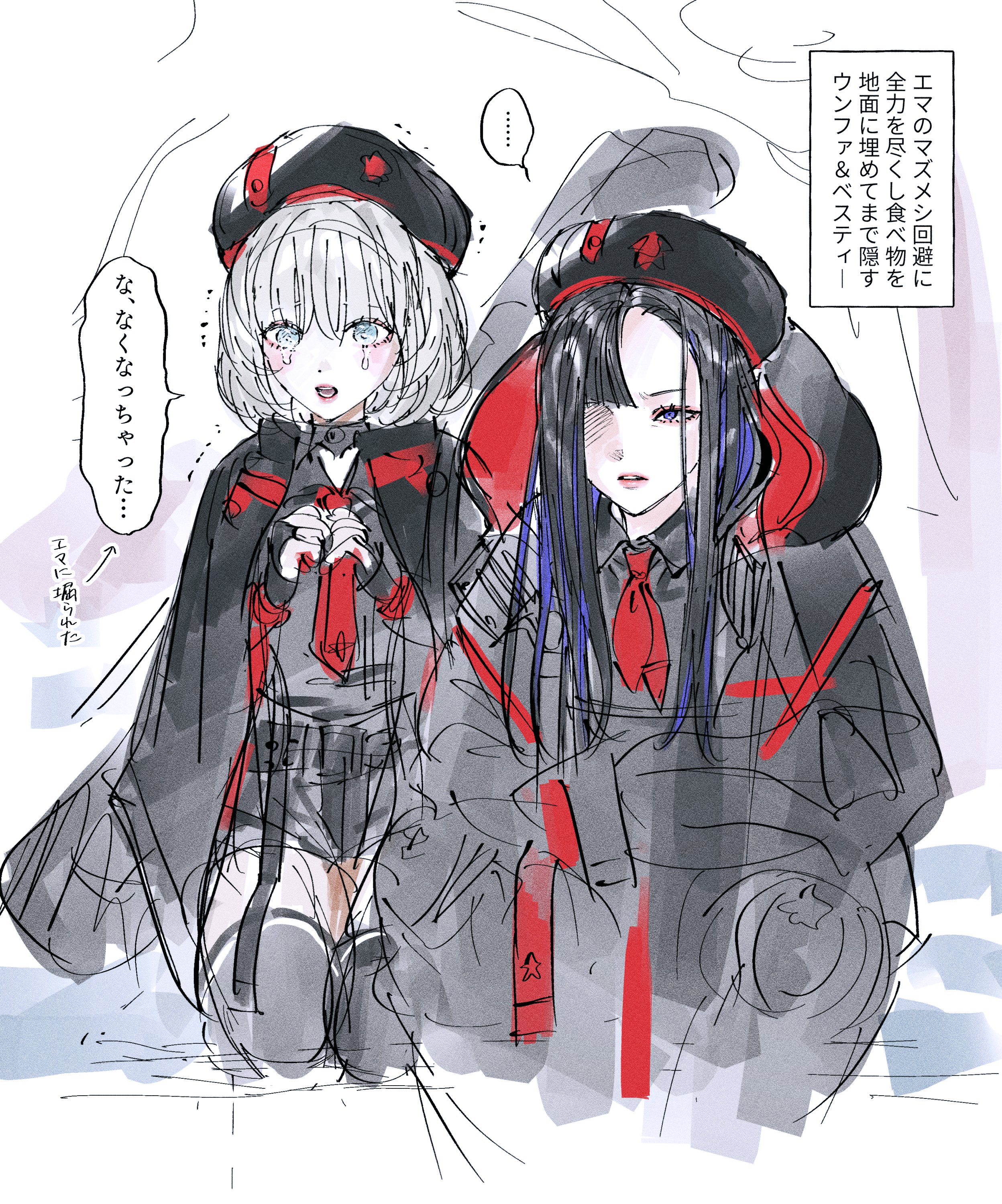 2girls absurdres asymmetrical_bangs beret black_cape black_gloves black_hair black_headwear black_jacket black_shorts black_thighhighs blue_eyes blush cape colored_inner_hair eunhwa_(nikke) fingerless_gloves forehead gloves goddess_of_victory:_nikke hat highres himo_(himodayoo) hood hood_down hooded_jacket jacket kneeling long_hair looking_at_viewer mole mole_under_mouth multicolored_hair multiple_girls neckerchief necktie open_mouth purple_eyes purple_hair red_cape red_jacket red_neckerchief red_necktie short_hair shorts sketch tearing_up thighhighs two-sided_fabric two-sided_jacket two-tone_cape vesti_(nikke) white_hair