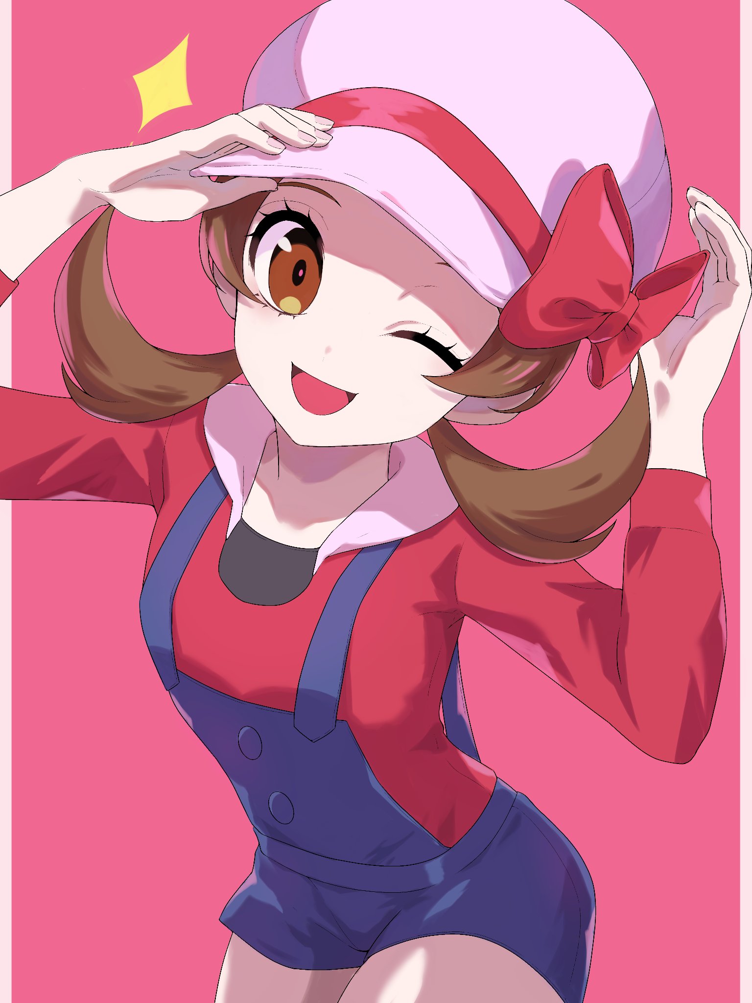 1girl ;d blue_overalls bow brown_eyes brown_hair commentary_request cowboy_shot dusk_poke27 eyelashes hands_up hat hat_bow highres long_hair looking_at_viewer lyra_(pokemon) nintendo one_eye_closed open_mouth overalls pink_background pokemon pokemon_heartgold_and_soulsilver red_bow red_shirt shirt simple_background smile solo twintails