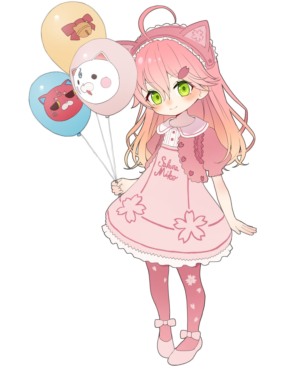 1girl aged_down ahoge alternate_costume arms_at_sides balloon blush child closed_mouth dress full_body gradient_hair green_eyes hair_between_eyes highres holding holding_balloon hololive long_hair looking_at_viewer mocha_(snowflake) multicolored_hair orange_hair pantyhose pink_dress pink_hair pink_pantyhose puffy_short_sleeves puffy_sleeves sakura_miko short_sleeves simple_background smile solo standing tachi-e virtual_youtuber white_background