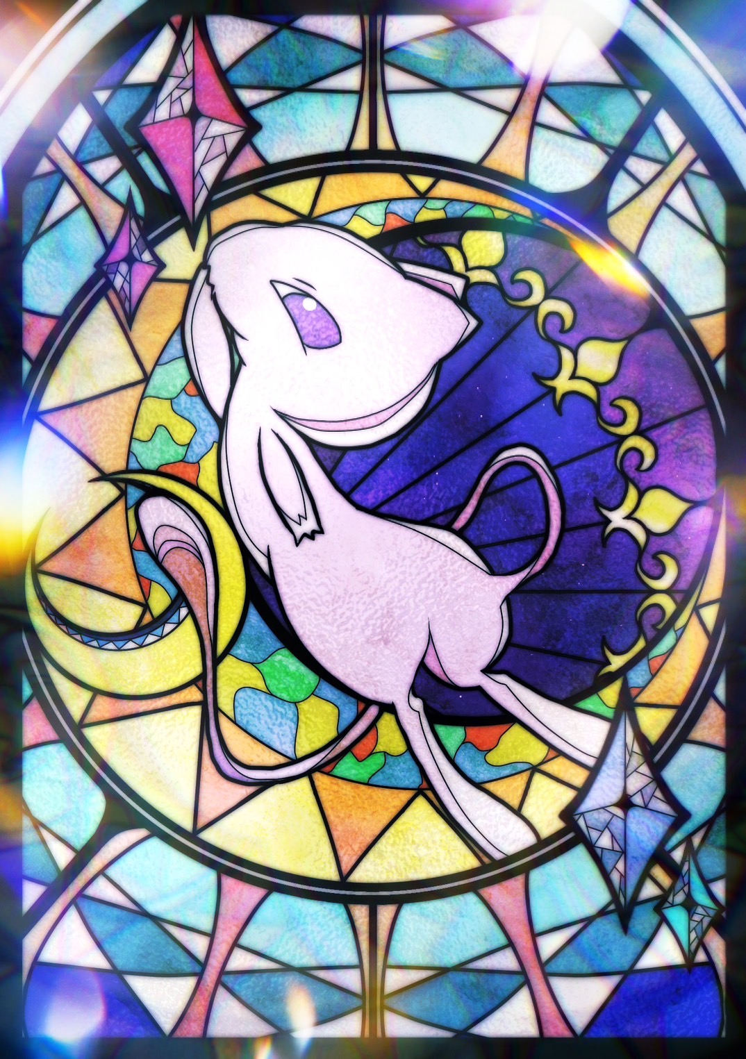 alternate_eye_color animal_focus arm_at_side arm_up black_border border covering_own_mouth crescent floating from_behind full_body gen_1_pokemon hand_to_own_mouth highres legendary_pokemon looking_at_viewer looking_back mew_(pokemon) multicolored_background mythical_pokemon nintendo no_humans pokemon pokemon_(creature) purple_eyes rize_(r) solo stained_glass