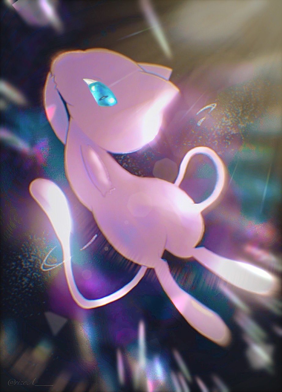 animal_focus arm_at_side arm_up blurry covering_own_mouth floating from_behind full_body gen_1_pokemon hand_to_own_mouth highres legendary_pokemon light_rays looking_at_viewer looking_back mew_(pokemon) mythical_pokemon nintendo no_humans pokemon pokemon_(creature) rize_(r) solo