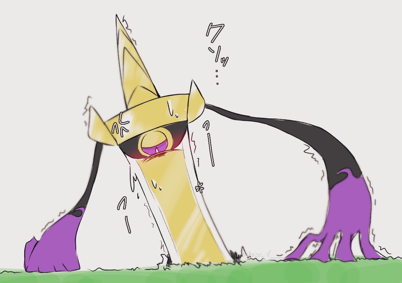 aegislash anger_vein angry artist_name black_sclera bright_pupils buried colored_sclera gen_6_pokemon grass grey_background half-closed_eyes heavy_breathing inconvenient_abilities japanese_text looking_down nintendo no_humans one-eyed outdoors planted pokemon pokemon_(creature) purple_eyes rize_(r) simple_background solo stuck sweat sword translation_request trembling twitter_username watermark weapon white_pupils