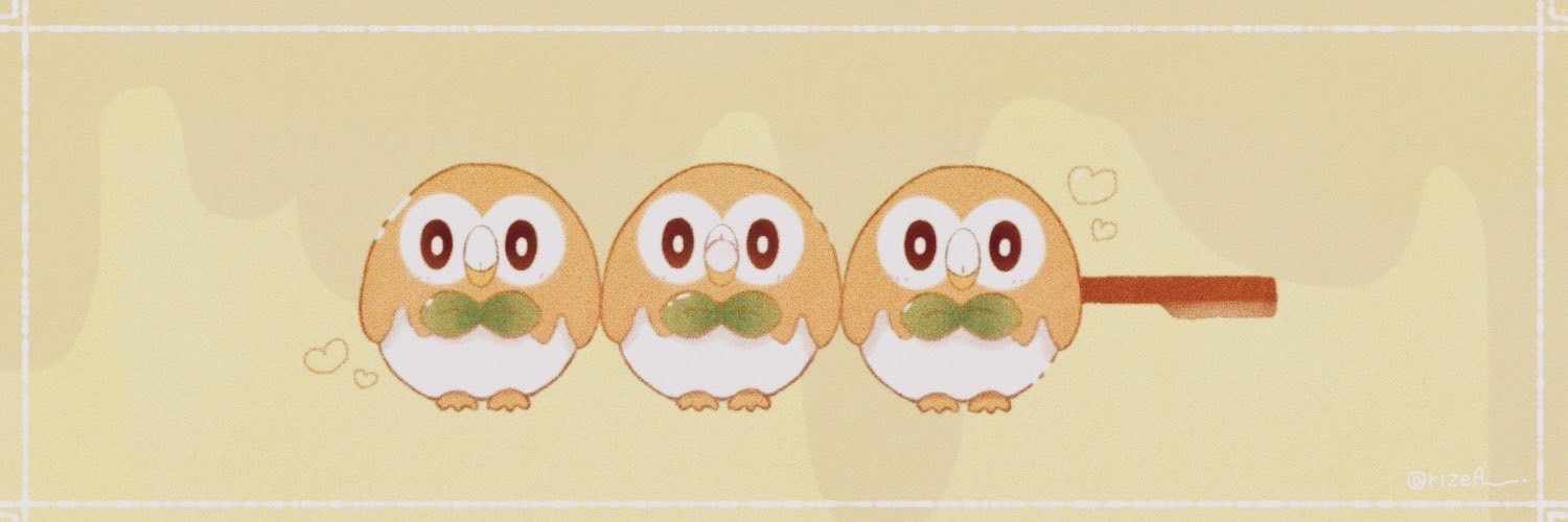 animal_focus bird black_eyes border bright_pupils closed_mouth dango food food_focus full_body gen_7_pokemon heart looking_at_viewer nintendo no_humans open_mouth pokemon pokemon_(creature) rize_(r) rowlet skewer straight-on takoyaki wagashi white_border white_pupils yellow_background