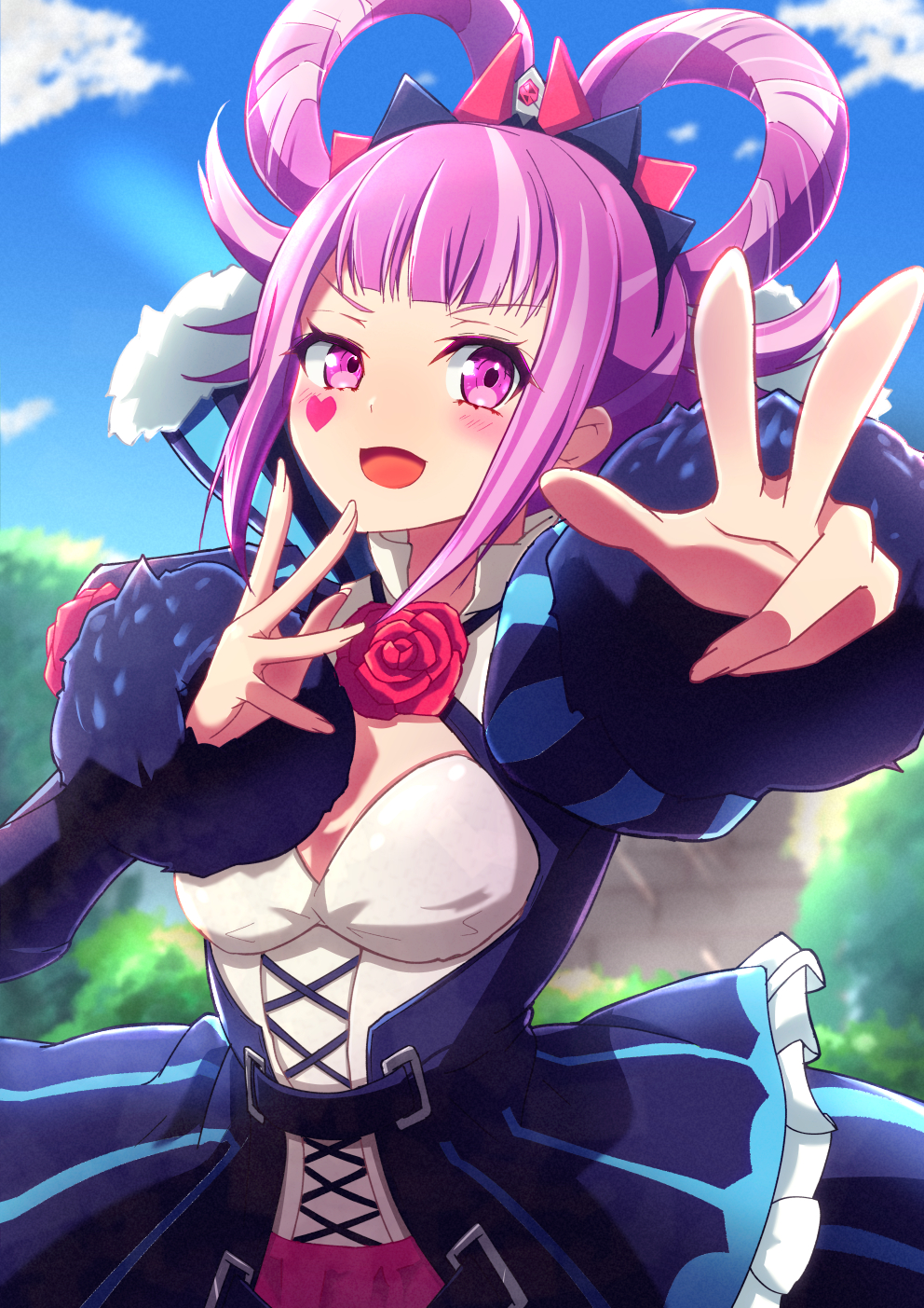 1girl blue_dress blue_sky blunt_bangs blurry blurry_background dress facial_mark fire_emblem fire_emblem_engage flower hair_rings heart heart_facial_mark highres hortensia_(fire_emblem) long_sleeves looking_at_viewer minamonochaba nintendo open_mouth outdoors pink_eyes pink_hair red_flower sky solo upper_body