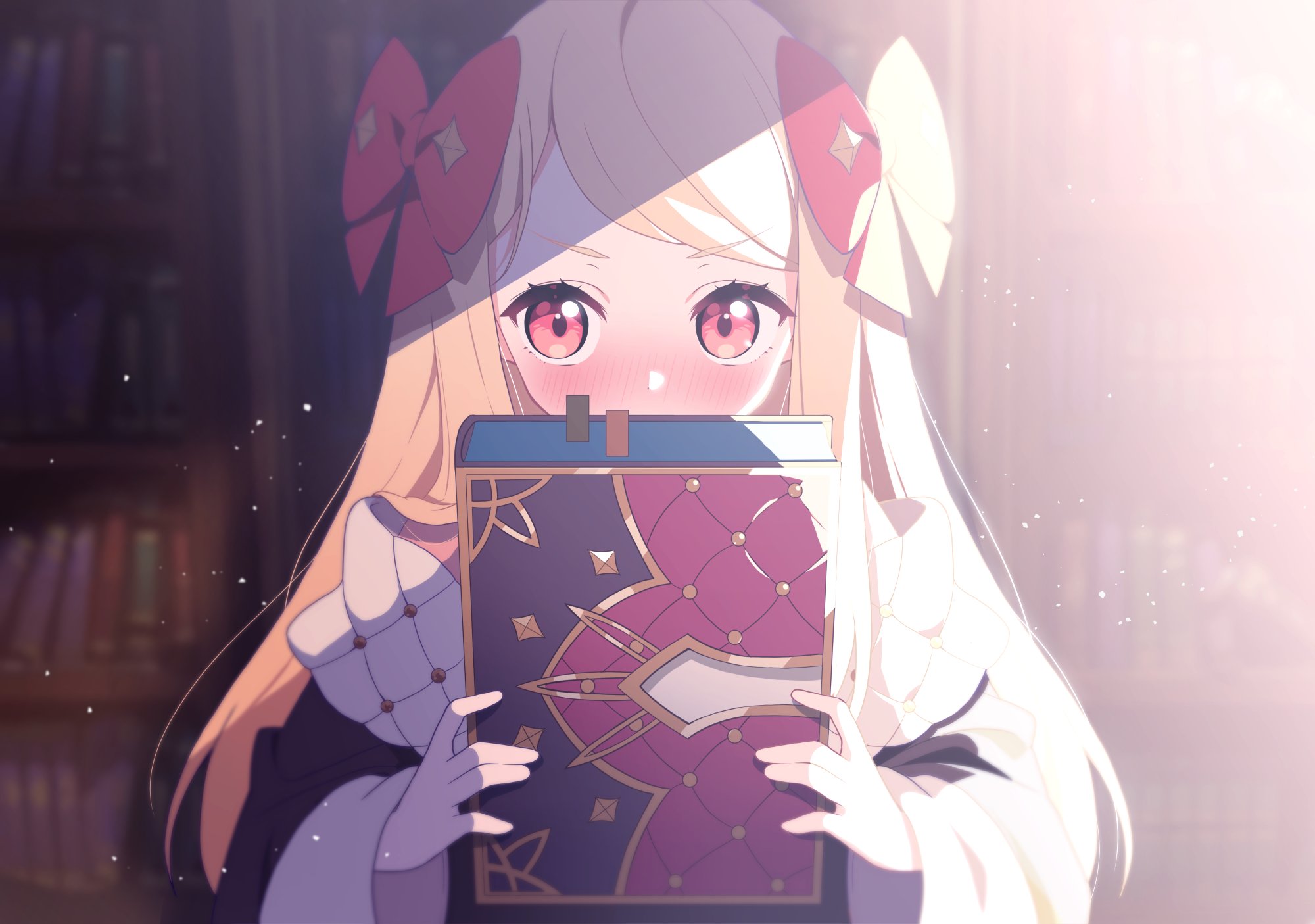 1girl bare_shoulders black_coat blonde_hair blush book bookshelf bow coat covered_mouth embarrassed eversoul hair_bow hair_ornament highres holding holding_book light_particles long_hair long_sleeves looking_to_the_side manon_(eversoul) nose_blush parted_lips petite red_bow red_eyes shirt solo sunlight swept_bangs upper_body white_shirt yotte