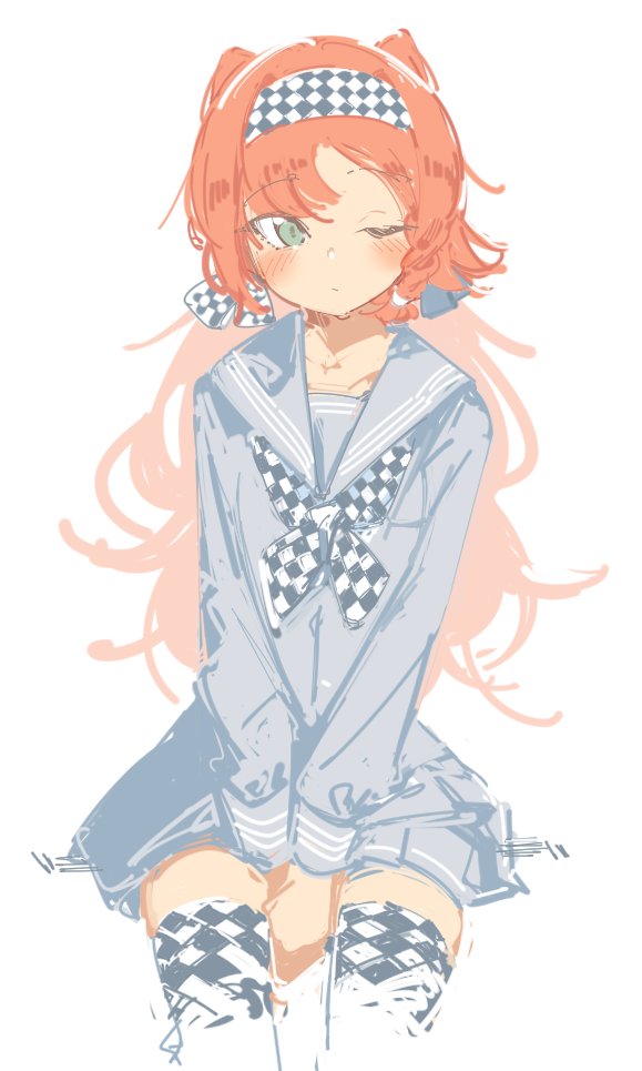 1girl blush braid checkered_hairband checkered_thighhighs closed_mouth contemporary green_eyes grey_sailor_collar grey_shirt grey_skirt hairband long_hair one_eye_closed orange_hair pleated_skirt rasusurasu reverse:1999 sailor_collar school_uniform serafuku shirt side_braid simple_background sitting skirt solo sonetto_(reverse:1999) two_side_up white_background