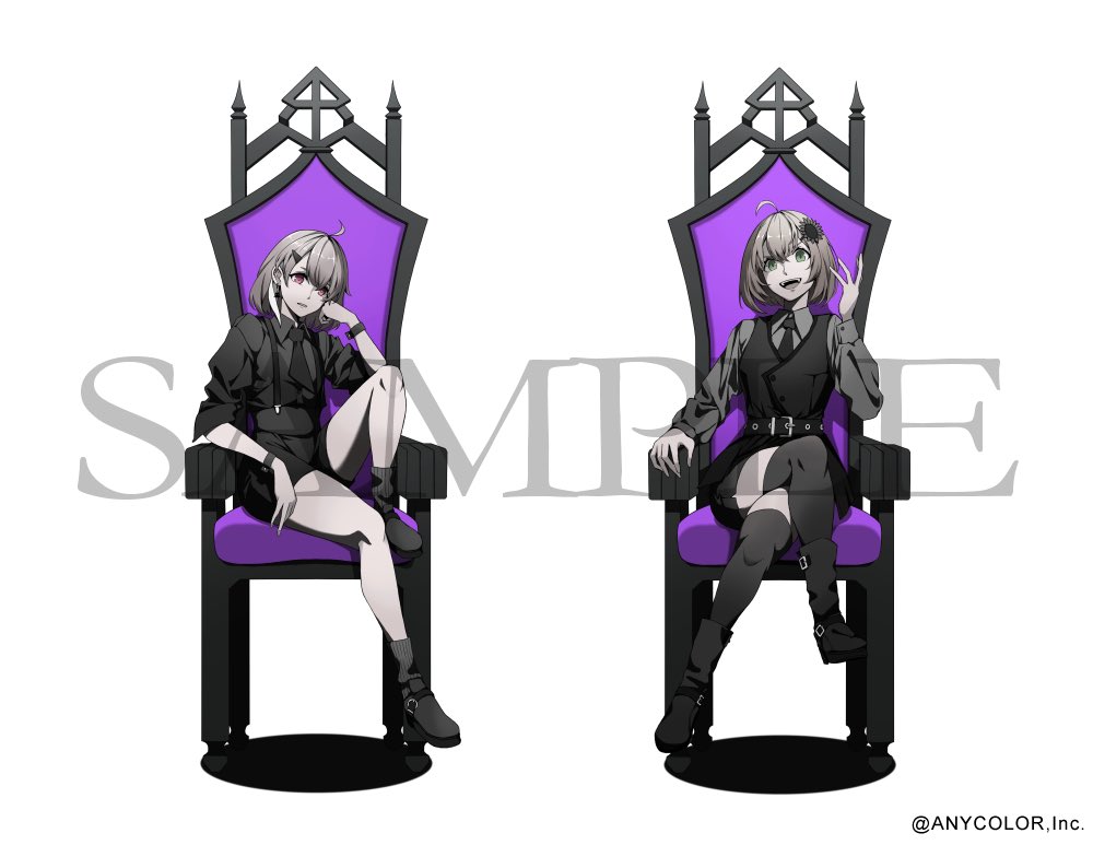 2girls :d ahoge belt belt_buckle bob_cut boots buckle collared_shirt copyright_notice crossed_legs expressionless flower full_body green_eyes greyscale hair_between_eyes hair_flower hair_ornament hairclip hand_up honma_himawari in_(in_0907) knee_up lineup long_sleeves looking_at_viewer monochrome multiple_girls necktie nijisanji official_art on_throne open_mouth parted_lips purple_eyes sample_watermark sasaki_saku shirt shorts simple_background sitting sitting_sideways sleeves_rolled_up smile socks spot_color sunflower sunflower_hair_ornament suspender_shorts suspenders thighhighs throne v-shaped_eyebrows vest virtual_youtuber watermark white_background wrist_cuffs