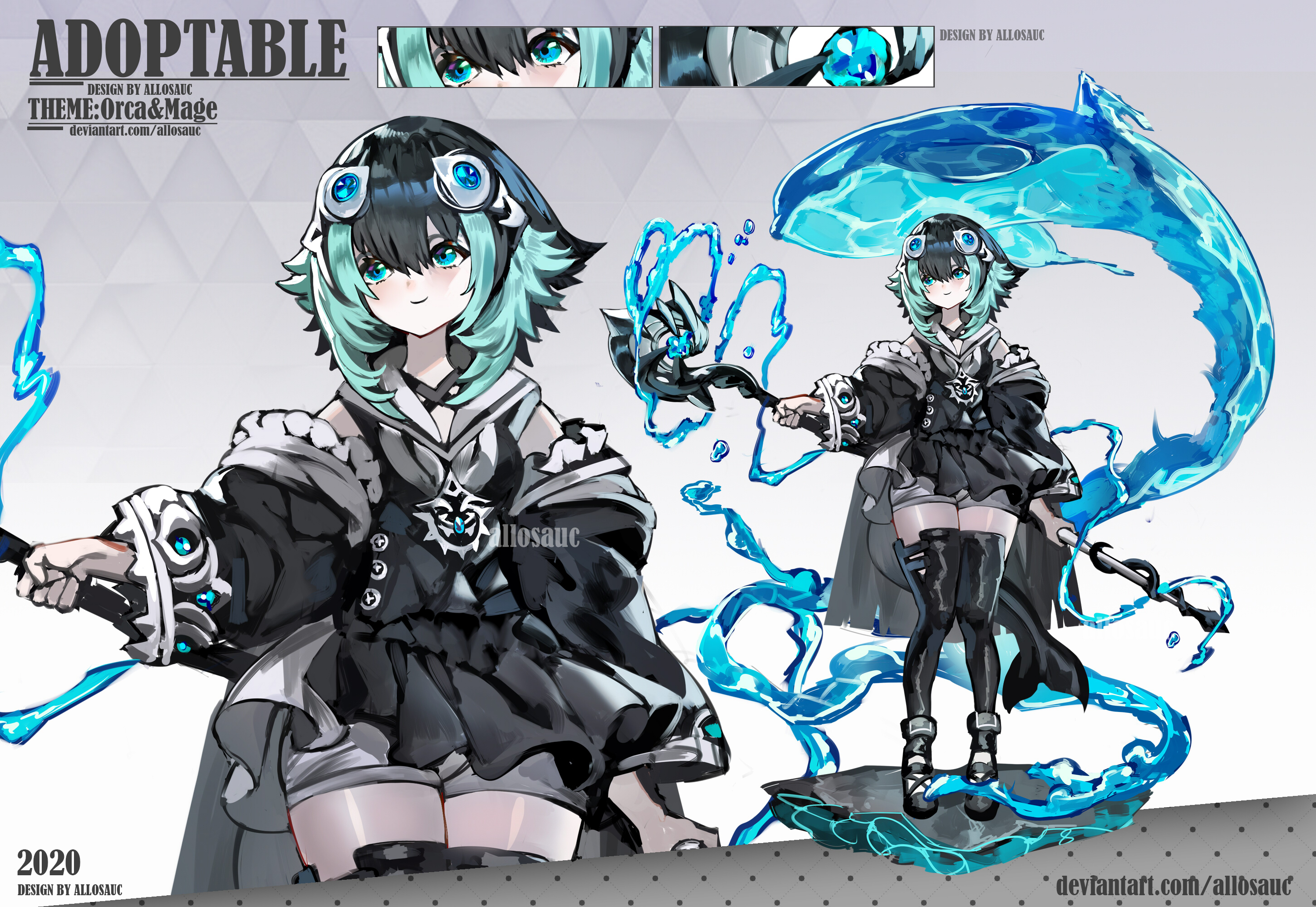 1girl 2020 adoptable allosauc ankle_cuffs artist_name bare_shoulders black_dress black_footwear black_hair black_jacket black_sleeves black_thighhighs blue-tinted_eyewear blue_eyes blue_hair boots reference_sheet close-up closed_mouth collared_dress commentary cowboy_shot deviantart_username dress english_commentary english_text full_body goggles goggles_on_head gradient_background grey_background hair_between_eyes highres holding holding_staff hydrokinesis jacket jacket_partially_removed long_sleeves looking_at_viewer mage_staff multicolored_hair multiple_views orca original pleated_skirt round_eyewear sailor_collar short_dress short_hair_with_long_locks short_shorts shorts shorts_under_dress simple_background skirt sleeveless sleeveless_dress smile staff thighhighs tinted_eyewear triangle_background two-tone_hair water watermark white-framed_eyewear white_sailor_collar white_shorts