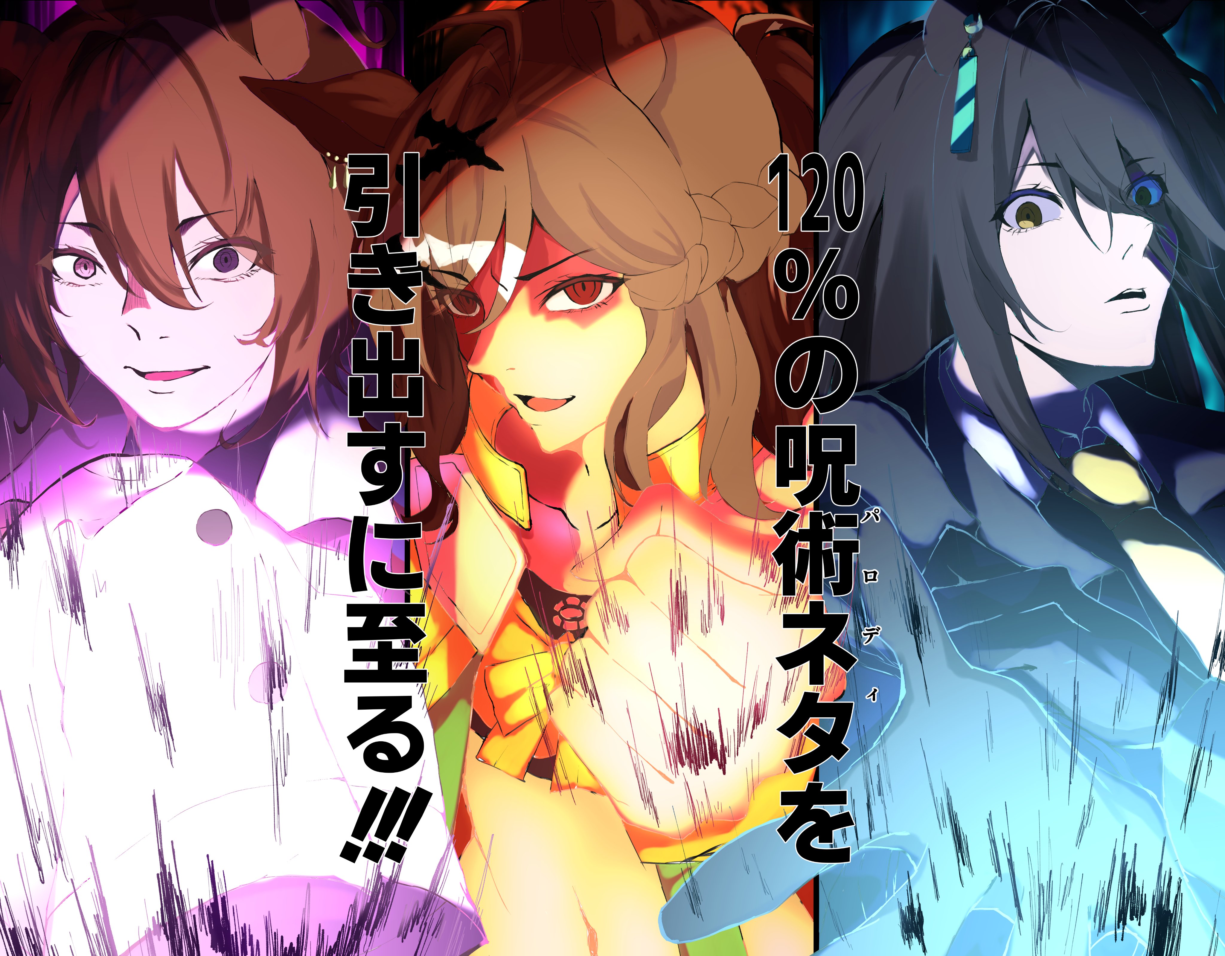 3girls absurdres agnes_tachyon_(tach-nology)_(umamusume) agnes_tachyon_(umamusume) ahoge animal_ears black_gloves black_hair brown_hair clenched_hands gloves hair_between_eyes highres horse_ears horse_girl jujutsu_kaisen jungle_pocket_(umamusume) lab_coat long_hair long_sleeves manhattan_cafe_(umamusume) multiple_girls necktie parody potechitarou purple_eyes red_eyes short_hair sleeves_past_fingers sleeves_past_wrists umamusume umamusume:_beginning_of_a_new_era upper_body yellow_eyes yellow_necktie