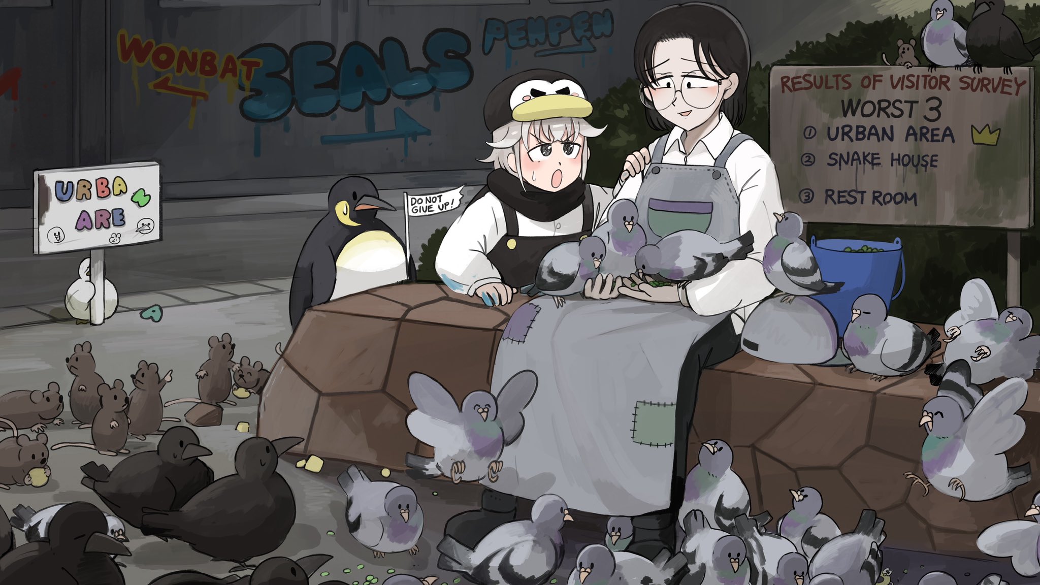 2girls :o bird black_hair black_overalls black_scarf bucket comforting commentary crow diva_(hyxpk) donut_stamp duck english_commentary english_text glasses graffiti grey_hair grey_overalls hat highres king_penguin mouse_(animal) multiple_girls overalls penguin penguin_hat penguin_keeper_(diva) pigeon round_eyewear scarf shirt short_hair sitting slice_of_life urban_area_keeper_(diva) white_shirt zoo zookeeper zookeepers_(diva)