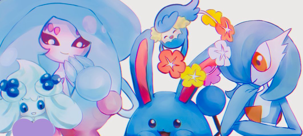 3girls :3 ^_^ alcremie alcremie_(berry_sweet) alcremie_(mint_cream) alternate_color azumarill black_eyes black_sclera blue_hair blue_headwear blue_skin blue_theme blush bob_cut butter_(oshi8kyoumoh) closed_eyes closed_mouth color_connection colored_sclera colored_skin comfey female_focus flat_chest flower gardevoir gen_2_pokemon gen_3_pokemon gen_7_pokemon gen_8_pokemon gradient_hair grey_background hair_over_one_eye hand_to_own_mouth hand_up happy hat hatterene heart light_blush long_hair looking_at_another looking_at_viewer multicolored_hair multicolored_skin multiple_girls nintendo one_eye_covered open_mouth orange_eyes pink_flower pink_hair pokemon pokemon_(creature) prehensile_hair red_flower shiny_pokemon short_hair sidelocks simple_background smile streaked_hair two-tone_hair two-tone_skin upper_body white_eyes white_flower white_skin yellow_flower