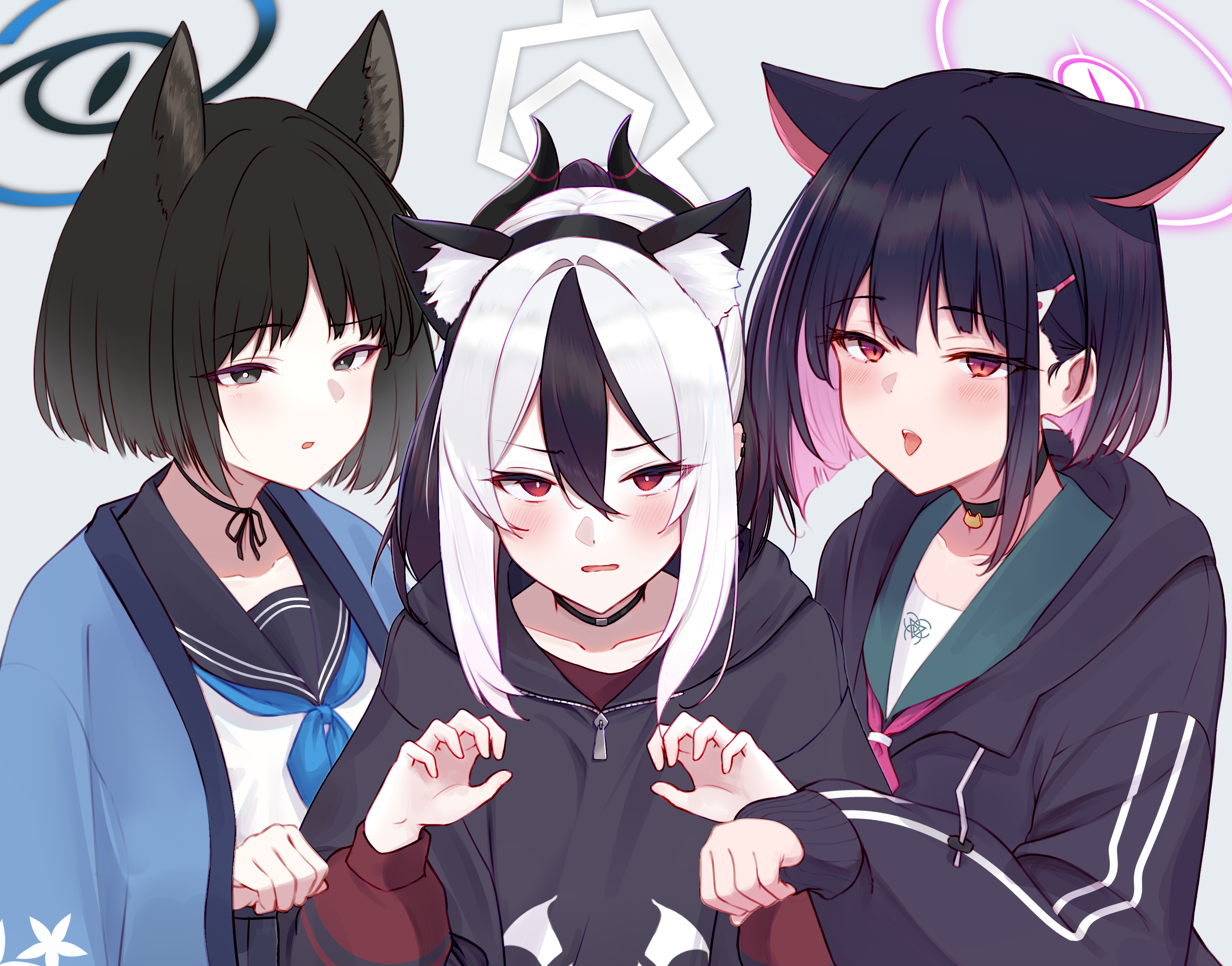 3girls animal_ears black_hair black_hoodie black_horns black_jacket black_sailor_collar blue_archive blue_halo blue_neckerchief blush cat_ears choker colored_inner_hair demon_horns fake_animal_ears green_sailor_collar grey_eyes grey_halo hair_between_eyes halo haori highres hood hooded_jacket hoodie horns jacket japanese_clothes kayoko_(blue_archive) kazusa_(blue_archive) kikyou_(blue_archive) long_sleeves multicolored_hair multiple_girls multiple_horns neckerchief open_mouth pink_hair pink_halo print_hoodie red_eyes sailor_collar short_hair simple_background tongue tongue_out two-tone_hair white_background white_hair yata_mawari