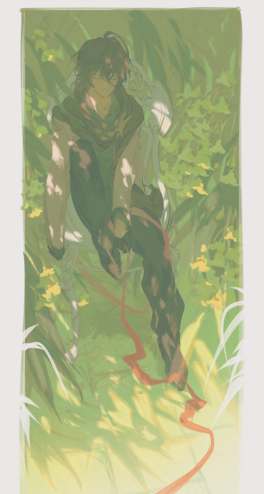 1boy bishounen black_gloves black_pants black_shirt brown_hair brown_scarf closed_eyes expressionless gloves granblue_fantasy grass hair_between_eyes highres holding holding_unworn_clothes holding_unworn_scarf jacket knee_up light light_rays male_focus messy messy_hair official_alternate_costume on_ground open_clothes open_jacket pants plant red_scarf sandalphon_(granblue_fantasy) scarf shirt short_hair sitting solo_focus t_of_game tall_grass unworn_scarf white_jacket
