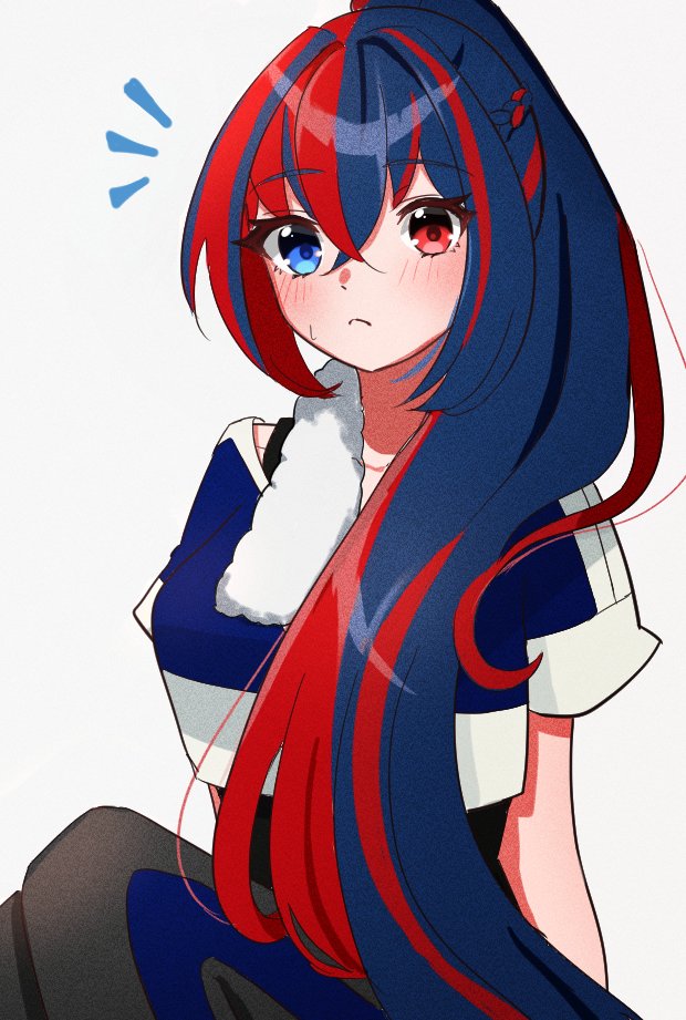 1girl female_alear_(fire_emblem) blue_eyes blue_hair blush fire_emblem fire_emblem_engage gmais2514 hair_between_eyes heterochromia long_hair multicolored_hair nintendo official_alternate_costume official_alternate_hairstyle ponytail red_eyes red_hair solo split-color_hair training_outfit_(fire_emblem_engage) two-tone_hair white_background