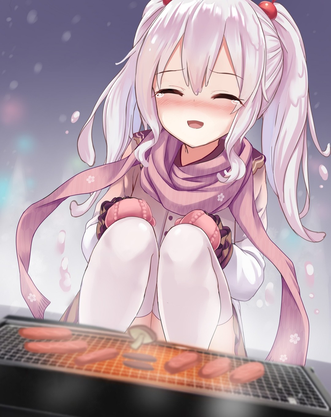 1girl blurry blurry_background blush chinese_commentary closed_eyes commentary_request depth_of_field facing_viewer female_focus flat_chest hair_between_eyes happy_tears highres long_hair long_sleeves milk-chan_(milkshakework) milkshakework mittens open_mouth original pink_scarf scarf sidelocks sitting skirt snow snowing solo tears thighhighs thighs twintails white_hair winter winter_clothes