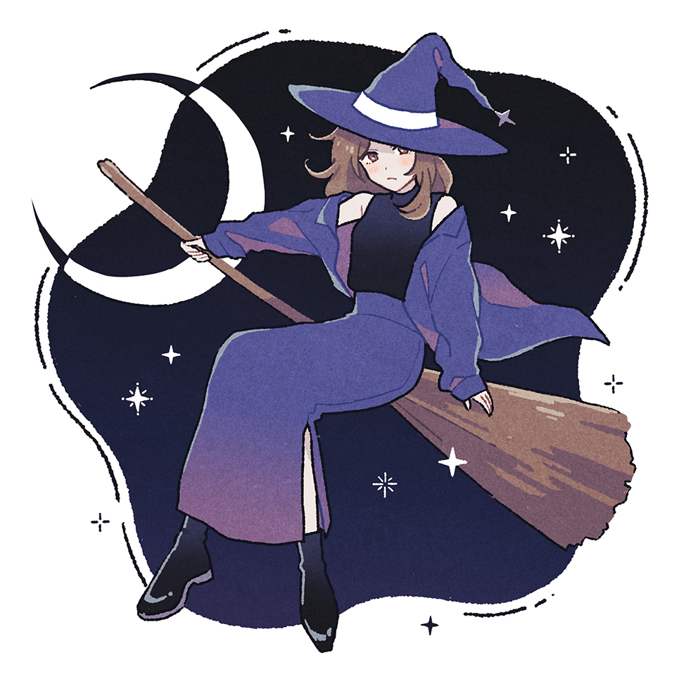 1girl ankle_boots bare_shoulders black_boots black_vest boots border broom broom_riding brown_eyes brown_hair closed_mouth commentary_request crescent dot_nose expressionless full_body halloween hat jacket light_blush long_hair long_skirt long_sleeves looking_at_viewer nahara_saki off_shoulder open_clothes open_jacket original purple_hat purple_jacket purple_skirt sidesaddle skirt sleeves_past_wrists solo turtleneck vest white_border witch witch_hat