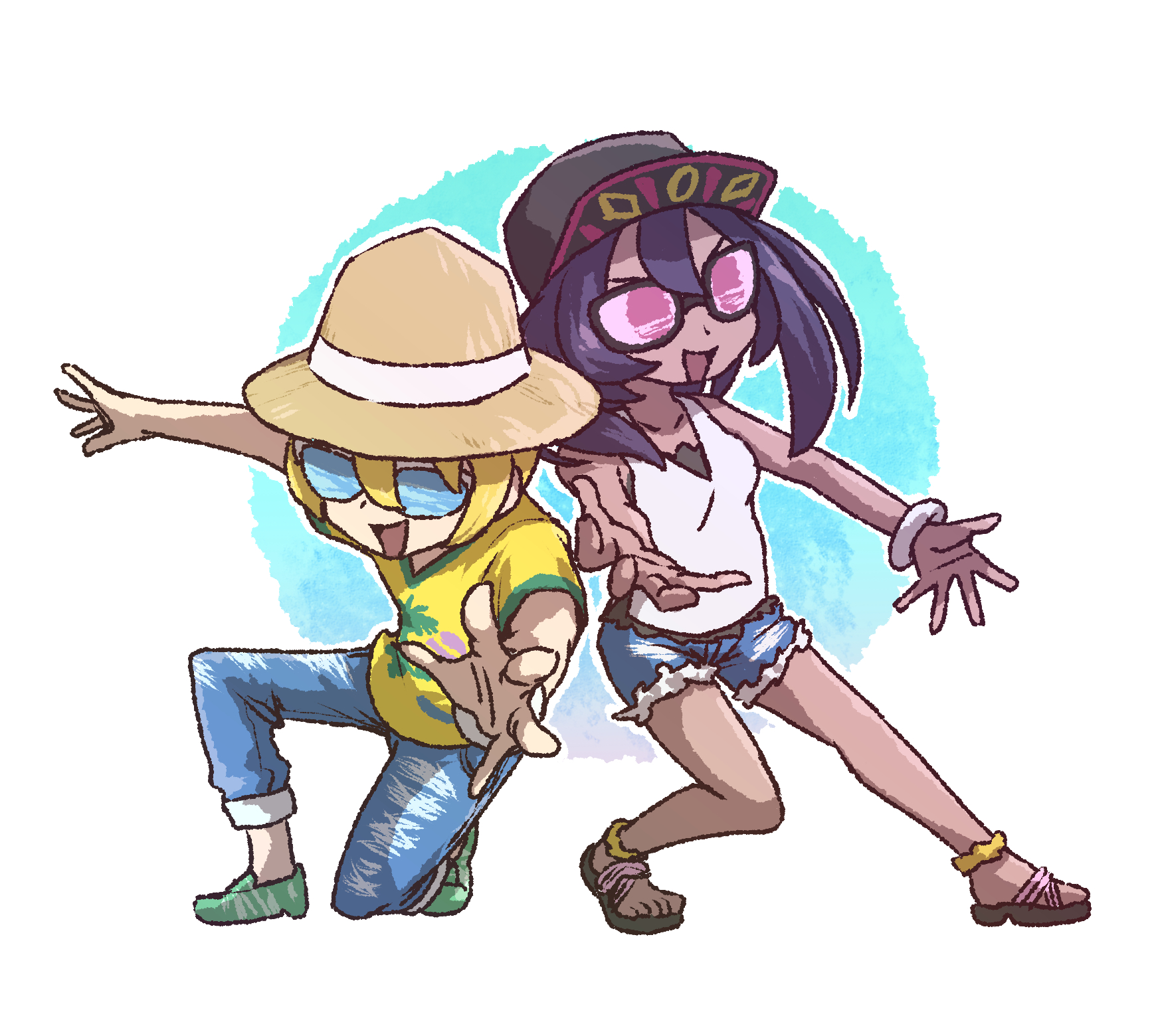 1boy 1girl baseball_cap blonde_hair brown_headwear dark-skinned_female dark_skin denim denim_shorts dexio_(pokemon) full_body green_footwear hat highres kotobukkii_(yt_lvlv) nintendo outstretched_arms pokemon pokemon_sun_and_moon purple_hair shirt shorts sina_(pokemon) sunglasses v-shaped_eyebrows yellow_shirt