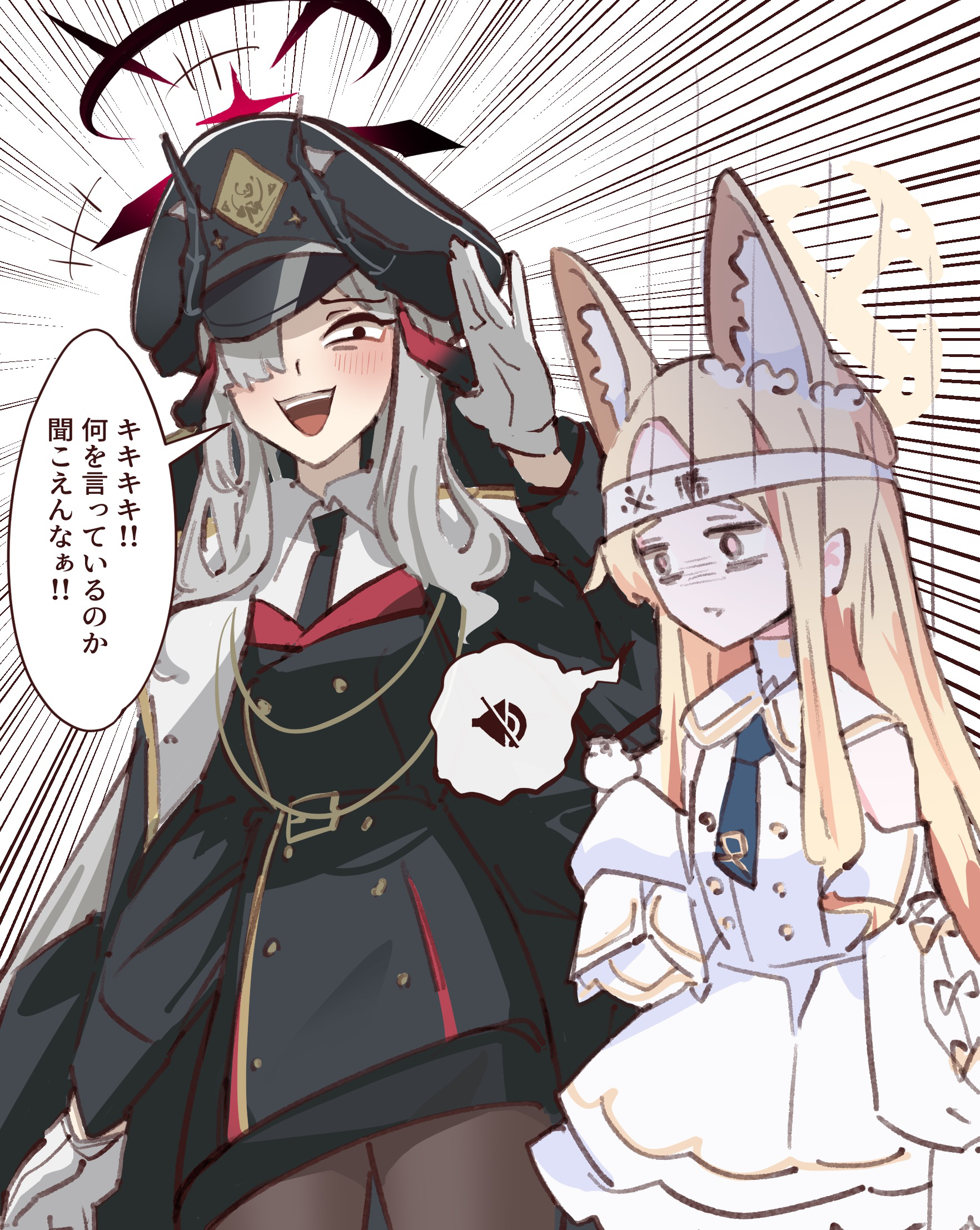 2girls bags_under_eyes bird bird_on_hand black_headwear black_jacket black_necktie blonde_hair blue_archive blue_hair blue_necktie buttons commentary_request demon_horns detached_sleeves double-breasted flower flower_wreath forehead gloves grey_hair hachimaki hair_flower hair_ornament hair_over_one_eye halo hat headband highres horns jacket long-tailed_tit long_sleeves looking_at_another makoto_(blue_archive) multiple_girls mute mute_speaker_sign necktie npc_jail open_mouth parted_bangs peaked_cap seia_(blue_archive) shirt short_necktie smile smug spoken_symbol swept_bangs takinohamira tit_(bird) translation_request white_gloves white_shirt