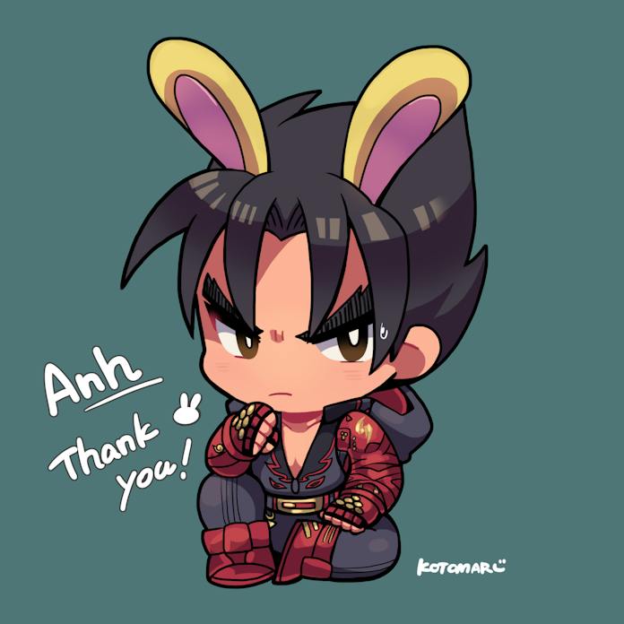 1boy angry belt black_eyes black_hair black_jacket black_pants bright_pupils bunny_hood_(zelda) chibi closed_mouth commentary commissioner_name english_commentary frown full_body gloves grey_background hood hood_down jacket kazama_jin kotomaru_(kotokoto_kottan) looking_at_viewer male_focus no_nose pants red_belt red_gloves short_hair signature simple_background solo studded_gloves tekken thank_you v-shaped_eyebrows white_pupils