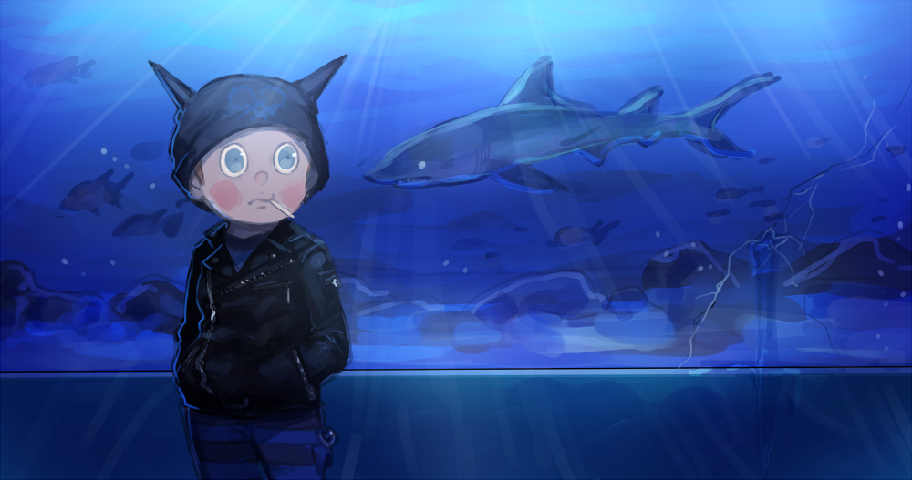 1boy animal_ear_headwear animal_ears aquarium belt black_belt black_headwear black_jacket black_jumpsuit black_sleeves blue_eyes blue_jumpsuit blush_stickers buttons cat_ears check_spoilers cigarette closed_mouth collared_jacket commentary_request cowboy_shot crack danganronpa_(series) danganronpa_v3:_killing_harmony expressionless fake_animal_ears fish hands_in_pockets holding holding_cigarette hoshi_ryoma indoors jacket jumpsuit kogarashi_8 leather leather_jacket long_sleeves looking_ahead male_focus mouth_hold partial_commentary prison_clothes rock shark solo spoilers striped_jumpsuit sunlight too_many too_many_fish two-tone_jumpsuit wavy_mouth zipper zipper_pull_tab
