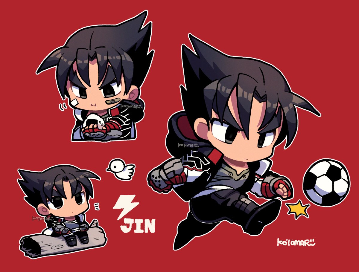 1boy ball bandaid bandaid_on_face black_eyes black_footwear black_hair black_pants character_name chewing chibi food full_body gloves grey_shirt holding holding_food hood hood_down kazama_jin kicking kotomaru_(kotokoto_kottan) lightning_bolt_symbol log male_focus multiple_views no_nose onigiri pants red_background red_gloves shirt signature simple_background sitting_on_log soccer_ball studded_gloves tekken tekken_8 thick_eyebrows v-shaped_eyebrows