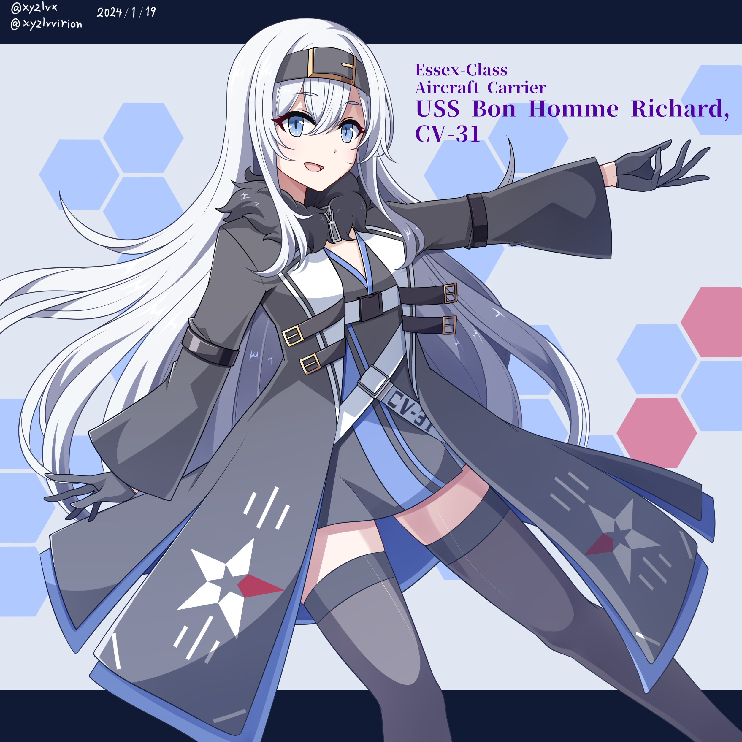 1girl :d absurdres azur_lane black_coat black_dress black_gloves black_hairband blue_eyes bon_homme_richard_(azur_lane) character_name coat commentary_request curly_hair dress fur-trimmed_coat fur_trim gloves hair_between_eyes hairband happy hebitsukai-san highres legs_apart long_hair long_sleeves open_clothes open_coat open_mouth outstretched_arm smile solo standing thighhighs very_long_hair white_hair wide_sleeves