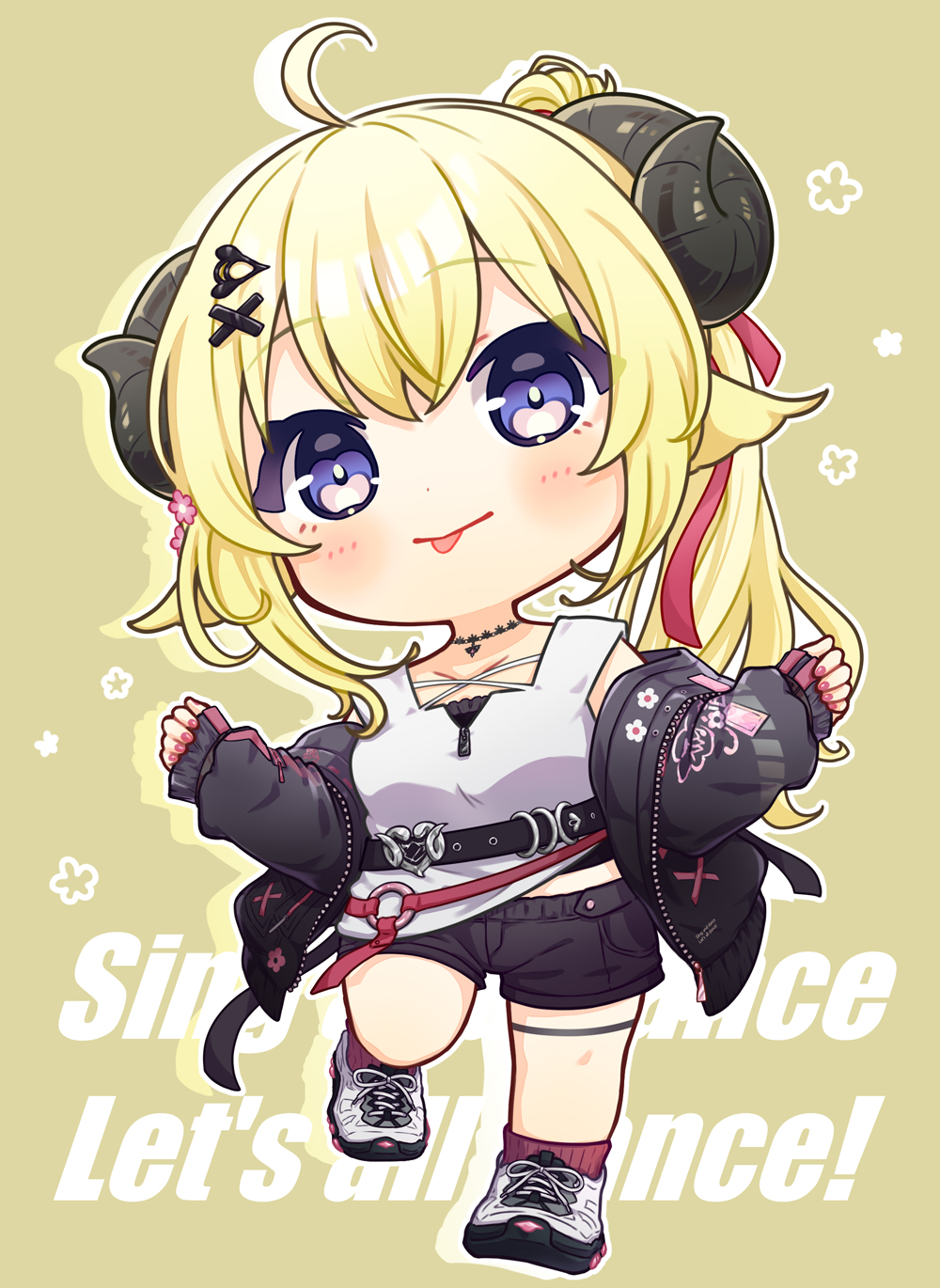 1girl :p ahoge animal_ears ashikawa_shiho black_jacket black_shorts blonde_hair blush chibi choker commentary hair_ornament hairclip highres hololive horns jacket long_hair looking_at_viewer official_alternate_costume official_alternate_hairstyle ponytail purple_eyes red_socks sheep_ears sheep_girl sheep_horns shoes shorts sneakers socks solo untranslatable_commentary tank_top tokino_sora tokino_sora_(casual) tongue tongue_out tsunomaki_watame tsunomaki_watame_(amazing_swing) virtual_youtuber white_tank_top x_hair_ornament