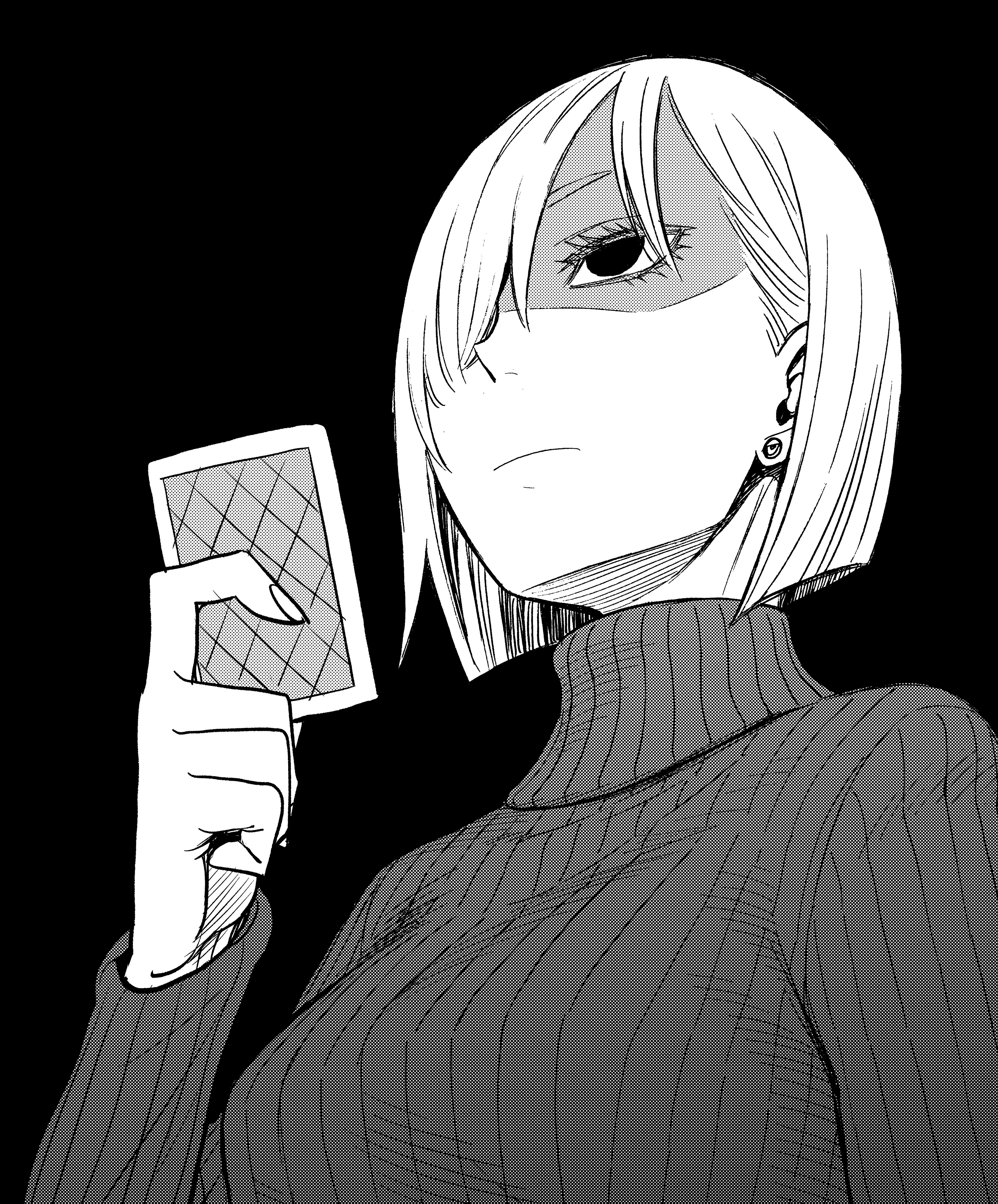 1girl absurdres bob_cut card ear_piercing endou_tatsuya fiona_frost hair_over_one_eye highres holding holding_card piercing short_hair spy_x_family sweater turtleneck turtleneck_sweater