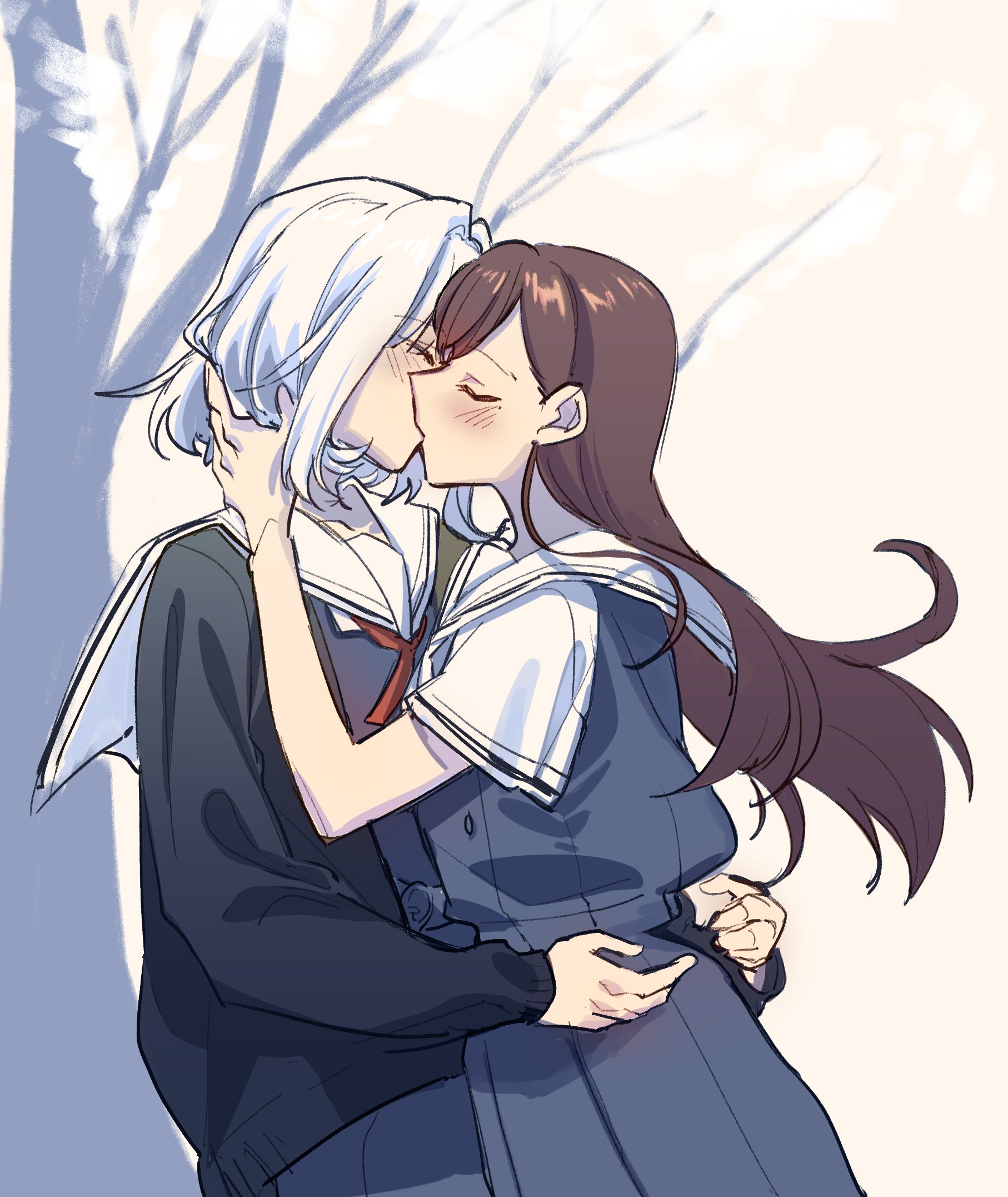 2girls asaka_kaori black_cardigan blue_dress blush brown_hair cardigan closed_eyes commentary cowboy_shot dress english_commentary greyscale hair_behind_ear hair_intakes hand_in_another's_hair highres hoshikawa_shizuku kei_(hasukeii) kimi_to_tsuzuru_utakata kiss long_hair long_sleeves mole mole_under_eye monochrome multiple_girls neck_ribbon open_cardigan open_clothes pinafore_dress pleated_dress red_ribbon ribbon sailor_collar sailor_dress school_uniform shirt short_hair short_sleeves sleeveless sleeveless_dress white_hair white_sailor_collar white_shirt yuri