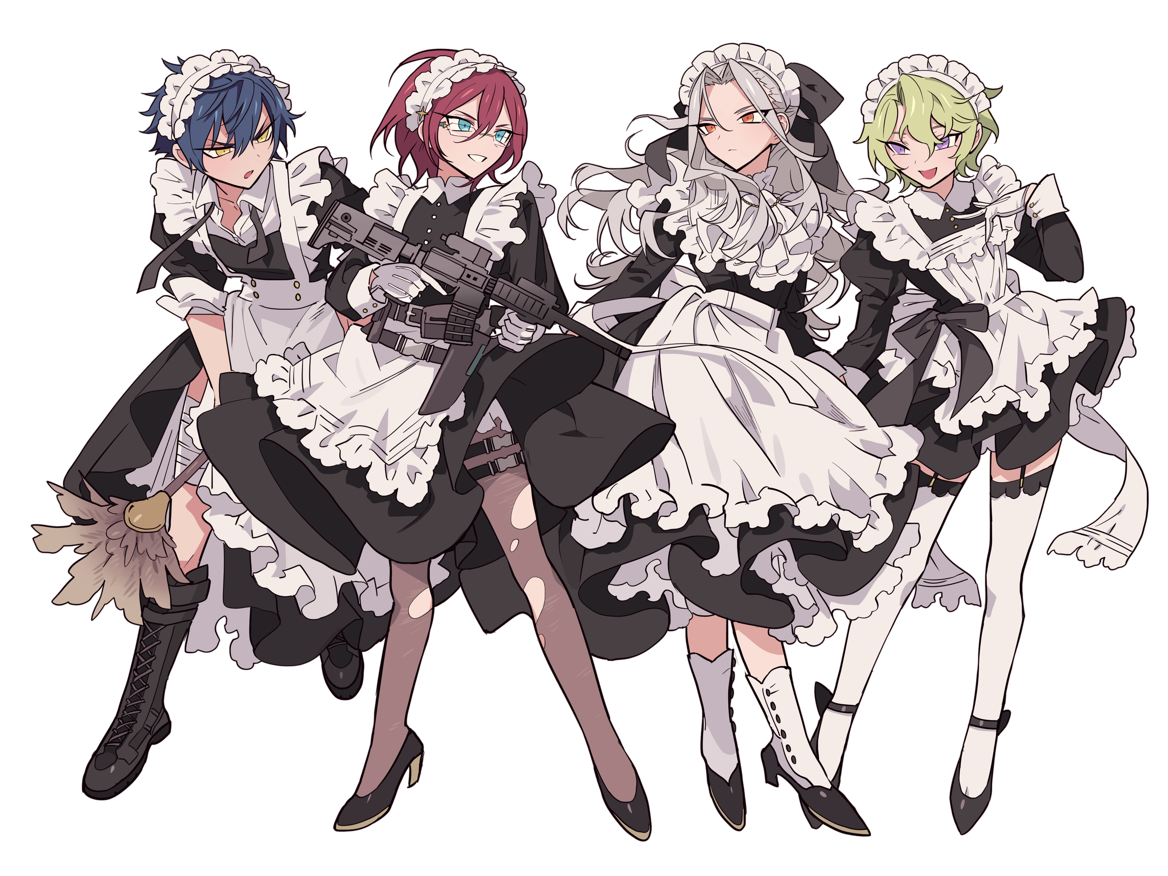 4boys absurdres alternate_costume apron assault_rifle black_dress black_footwear blue_eyes blue_hair boots closed_mouth collared_dress crossdressing crossdressing_(mtf) dress eden_(ensemble_stars!) enmaided ensemble_stars! frilled_apron frills full_body glasses gloves green_hair grey_hair gun hair_between_eyes hand_up high_heels highres holding holding_gun holding_weapon juliet_sleeves knee_boots long_hair long_sleeves looking_at_another maid maid_apron maid_headdress male_focus male_maid meremero multiple_boys open_mouth pantyhose puffy_sleeves purple_eyes ran_nagisa red_eyes red_hair rifle saegusa_ibara sazanami_jun short_hair simple_background smile standing thigh_strap thighhighs tomoe_hiyori torn_clothes torn_pantyhose waist_apron weapon white_apron white_background white_gloves white_thighhighs yellow_eyes