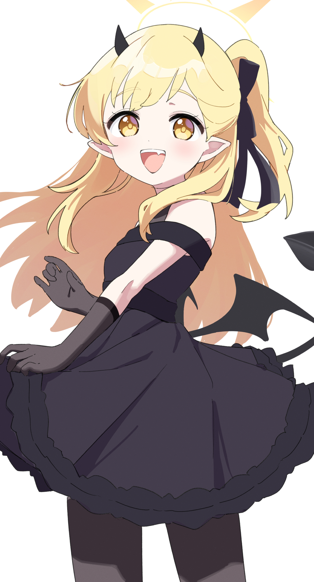 1girl :d black_dress black_gloves black_horns black_pantyhose black_tail blonde_hair blue_archive demon_horns demon_tail demon_wings dress evening_gown fang gloves halo highres horns ibuki_(blue_archive) ibuki_(dress)_(blue_archive) long_hair low_wings namaonpa official_alternate_costume open_mouth pantyhose pointy_ears side_ponytail simple_background sleeveless sleeveless_dress smile solo tail white_background wings yellow_eyes yellow_halo