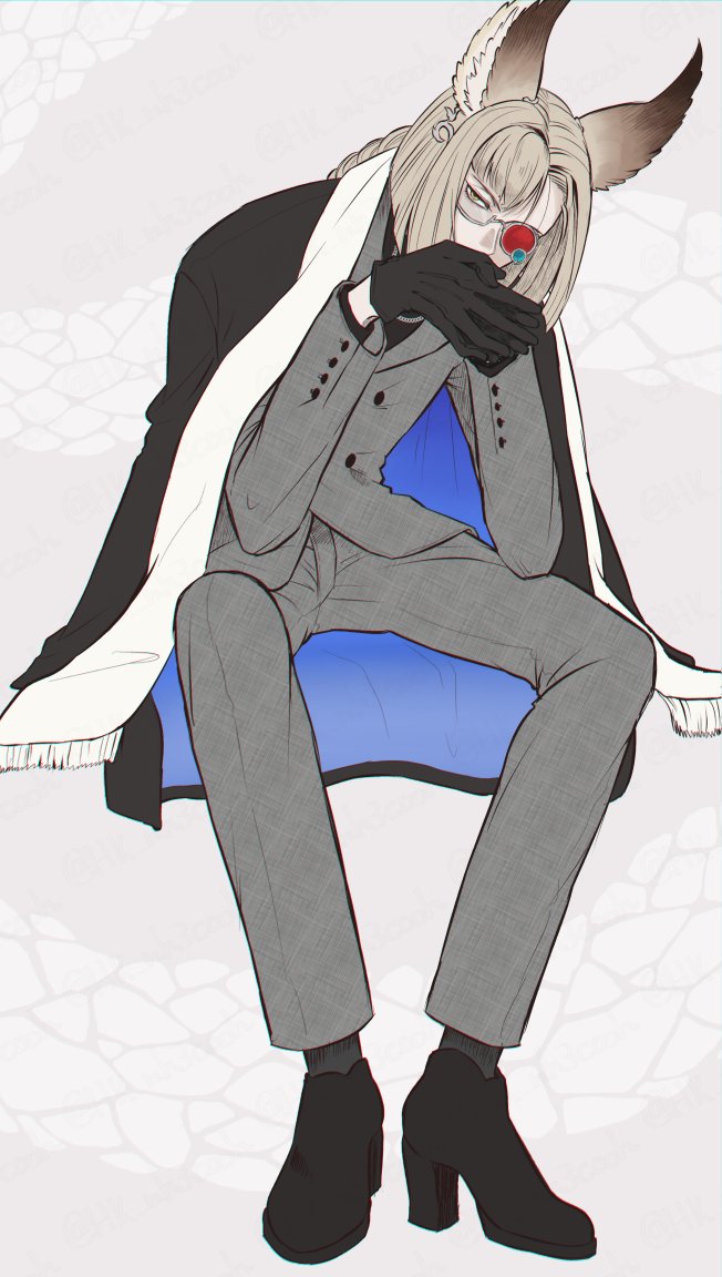 1boy alternate_costume animal_ears ankle_boots asymmetrical_bangs asymmetrical_eyewear black_boots black_coat black_shirt black_socks blonde_hair blunt_ends boots braid chain chain_necklace coat coat_on_shoulders covered_mouth cuff_links diagonal_bangs erune expressionless formal_clothes fringe_trim full_body glasses granblue_fantasy grey_background grey_jacket grey_pants grey_suit heterochromatic_eyewear high_heel_boots high_heels hk_nh3cooh invisible_chair jacket jewelry knees_apart_feet_together long_hair long_sleeves looking_at_viewer lu_woh_(granblue_fantasy) male_focus necklace own_hands_together pants scarf semi-rimless_eyewear shirt simple_background single_braid sitting socks solo stole suit tinted_eyewear two-sided_coat two-sided_fabric under-rim_eyewear white_scarf yellow_eyes
