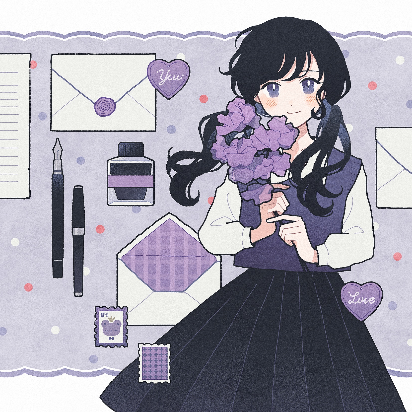 1girl black_hair black_skirt blouse blush closed_mouth commentary_request cowboy_shot crown_(symbol) dot_nose envelope flower heart highres holding holding_flower ink light_smile long_hair long_sleeves looking_at_viewer nahara_saki nib_pen_(object) original paper pen pleated_skirt postage_stamp purple_background purple_eyes purple_flower purple_sweater_vest shirt skirt solo split_mouth standing sweater_vest twintails unfinished wavy_hair wax_seal white_shirt