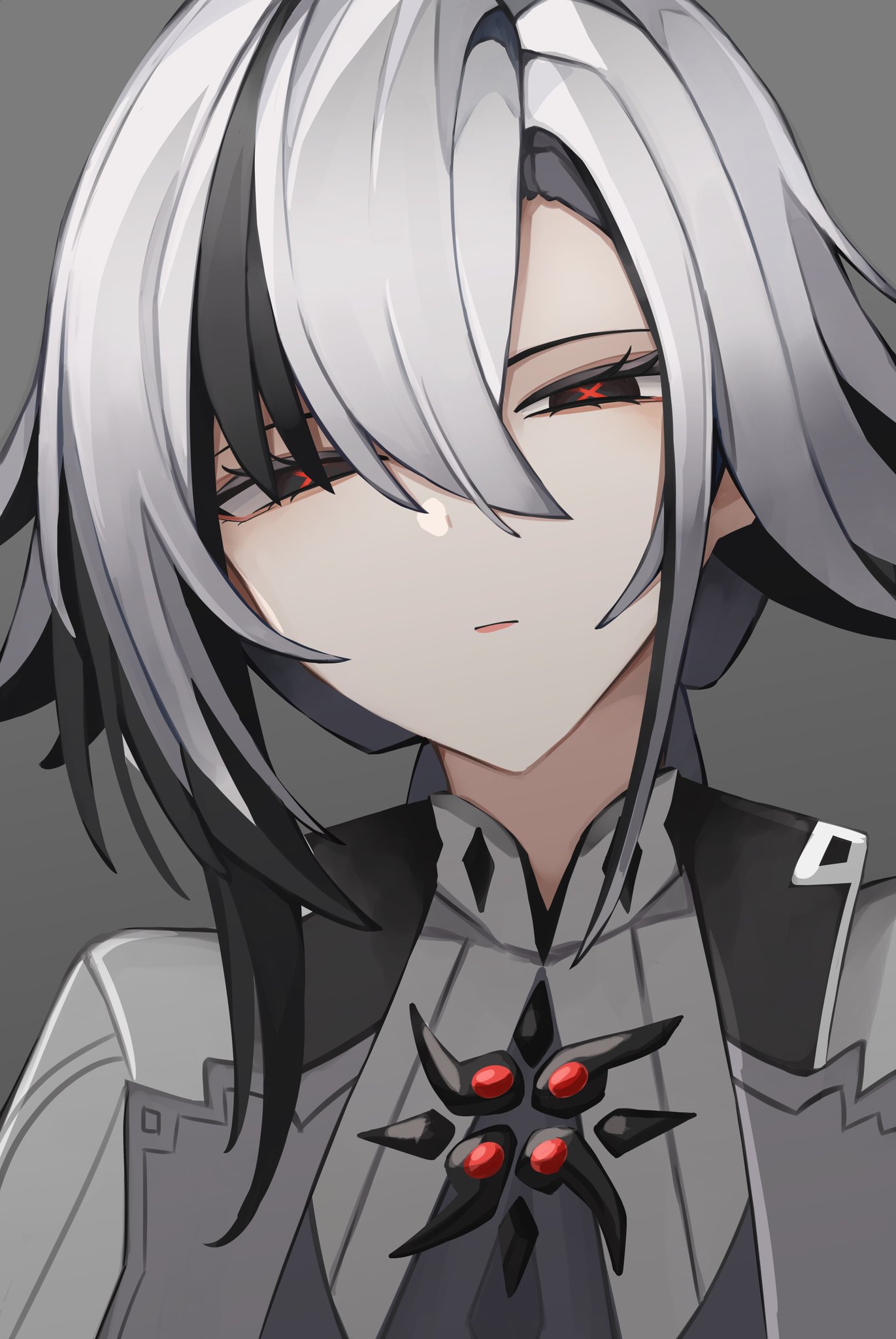 1girl arlecchino_(genshin_impact) black_hair closed_mouth commentary english_commentary eyebrows_hidden_by_hair genshin_impact grey_background grey_jacket grey_shirt grey_theme hair_between_eyes hair_over_one_eye half-closed_eyes highres jacket long_hair looking_at_viewer multicolored_hair portrait red_pupils shirt simple_background solo streaked_hair symbol-shaped_pupils two-tone_hair white_hair x-shaped_pupils yuu_azma