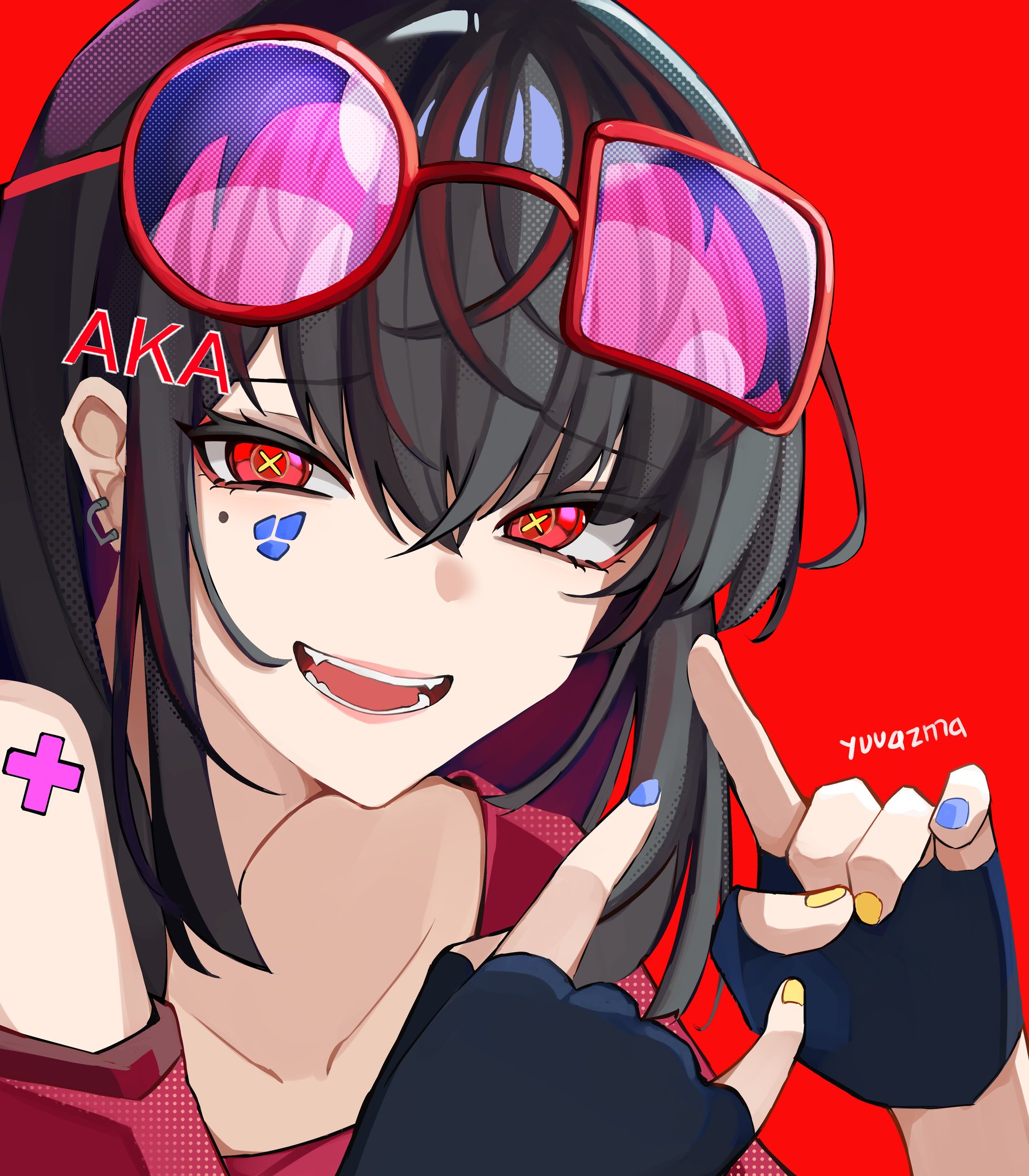 1girl artist_name asymmetrical_eyewear black_gloves black_hair blue_nails collarbone commentary crossed_bangs ear_piercing english_commentary eyewear_on_head fingerless_gloves furrowed_brow gloves hair_between_eyes halftone hands_up highres long_hair looking_at_viewer m/ mole mole_under_eye multicolored_nails open_mouth original piercing pink-tinted_eyewear pink_shirt portrait red-framed_eyewear red_background red_eyes romaji_text shirt signature simple_background single_bare_shoulder solo sticker sticker_on_face sticker_on_shoulder sunglasses symbol-shaped_pupils teeth tinted_eyewear tsurime x-shaped_pupils yellow_nails yellow_pupils yuu_azma
