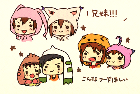 agumon_(digimon_savers) agumon_(digimon_savers)_(cosplay) blush cosplay costume daimon_masaru_(digimon_savers) digimon embarrassed happy koromon koromon_(cosplay) lopmon lopmon_(cosplay) piyomon piyomon_(cosplay) smile tailmon tailmon_(cosplay) terriermon terriermon_(cosplay) yagami_hikari yagami_taichi