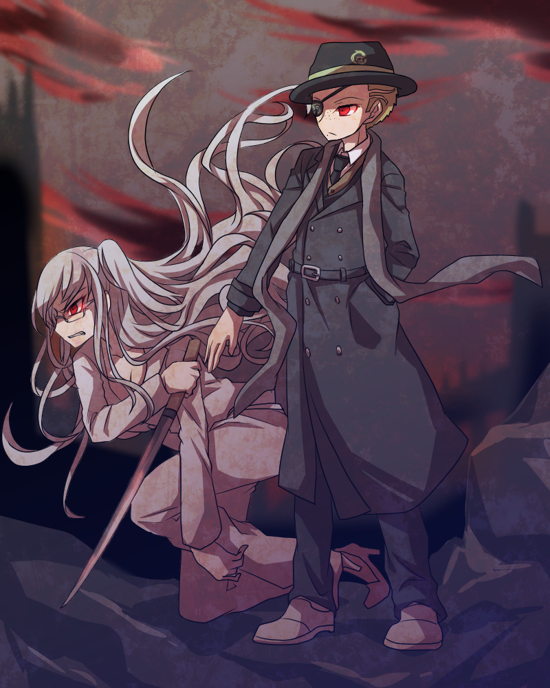 1boy 1girl alternate_costume alternate_hairstyle blonde_hair breasts cleavage danganronpa_(series) danganronpa_2:_goodbye_despair danganronpa_3_(anime) eyepatch high_heels holding holding_sword holding_weapon jacket katana kuzuryu_fuyuhiko long_hair long_sleeves medium_breasts necktie official_alternate_costume official_alternate_hairstyle pants pekoyama_peko red_eyes short_hair sword tagme weapon white_footwear white_jacket white_pants zi_huahuo