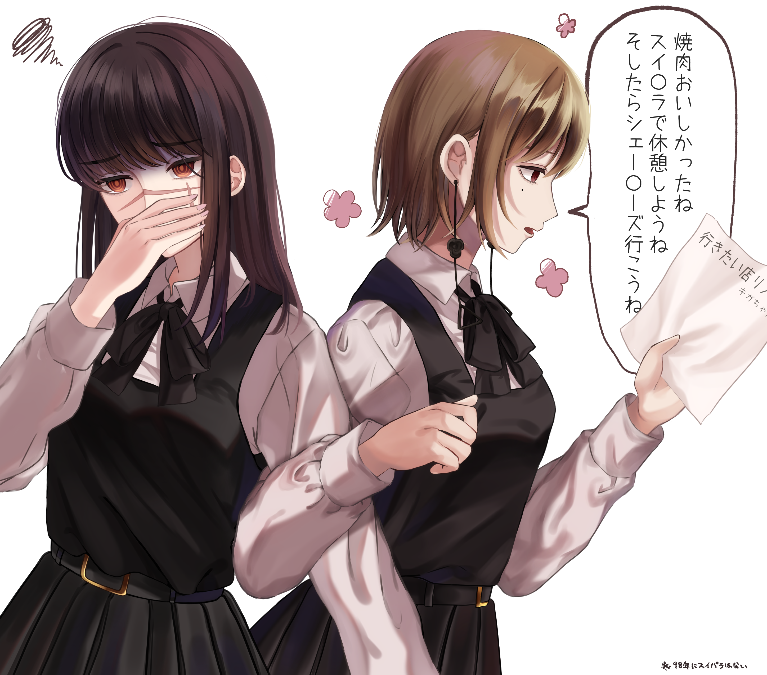 2girls absurdres amanami_(v) black_dress brown_hair chainsaw_man commentary_request covering_own_mouth cross_scar dress earrings facial_scar fami_(chainsaw_man) fourth_east_high_school_uniform highres holding holding_paper jewelry long_hair medium_hair mole mole_under_eye multiple_girls paper pinafore_dress pleated_dress red_eyes ringed_eyes scar scar_on_cheek scar_on_face scar_on_nose school_uniform sleeveless sleeveless_dress squiggle translation_request yoru_(chainsaw_man)