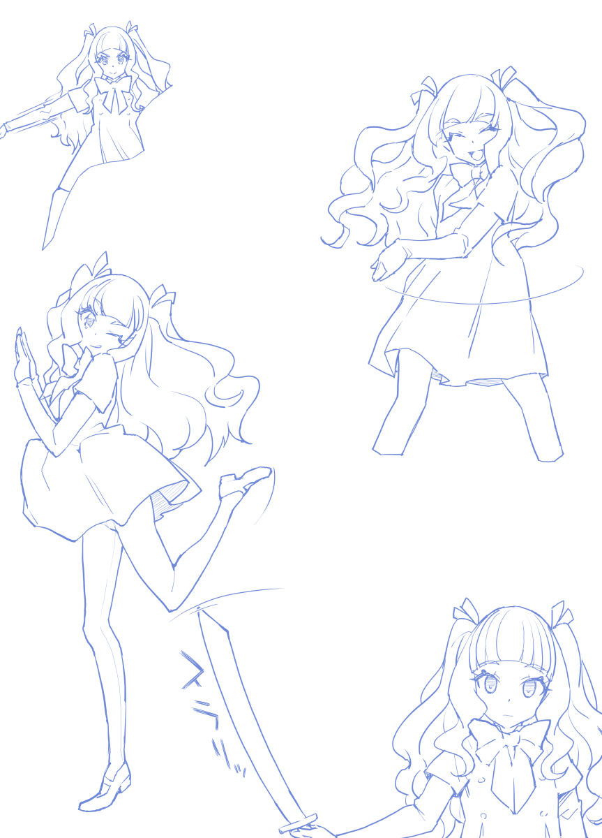 1girl ;q blue_theme blunt_bangs bow bowtie closed_eyes closed_mouth commentary dress ellee-chan empty_eyes multiple_expressions hair_ribbon highres hirogaru_sky!_precure holding holding_sword holding_weapon layered_sleeves leg_up long_hair long_sleeves looking_at_viewer mary_janes miyagoe_yoshitsuki monochrome one_eye_closed open_mouth pantyhose precure ribbon shoes short_dress short_over_long_sleeves short_sleeves smile standing standing_on_one_leg sword tongue tongue_out two_side_up weapon