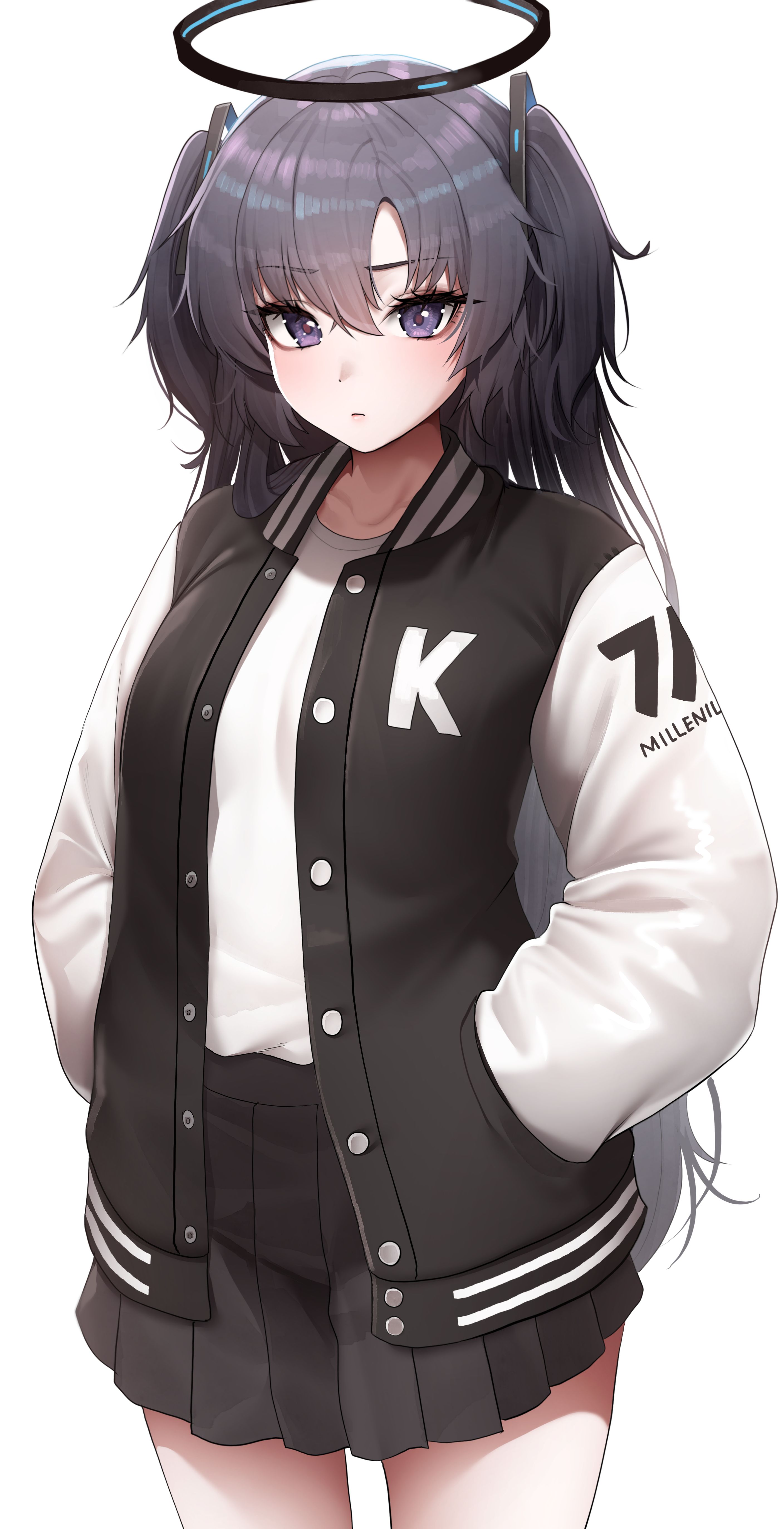 1girl absurdres alternate_costume black_hair blue_archive breasts doyoon_7 hair_between_eyes hair_ornament halo hands_in_pockets highres jacket korean_commentary letterman_jacket long_hair long_sleeves looking_at_viewer medium_breasts open_clothes open_jacket pleated_skirt purple_eyes shirt simple_background skirt solo two_side_up very_long_hair white_background white_shirt yuuka_(blue_archive)