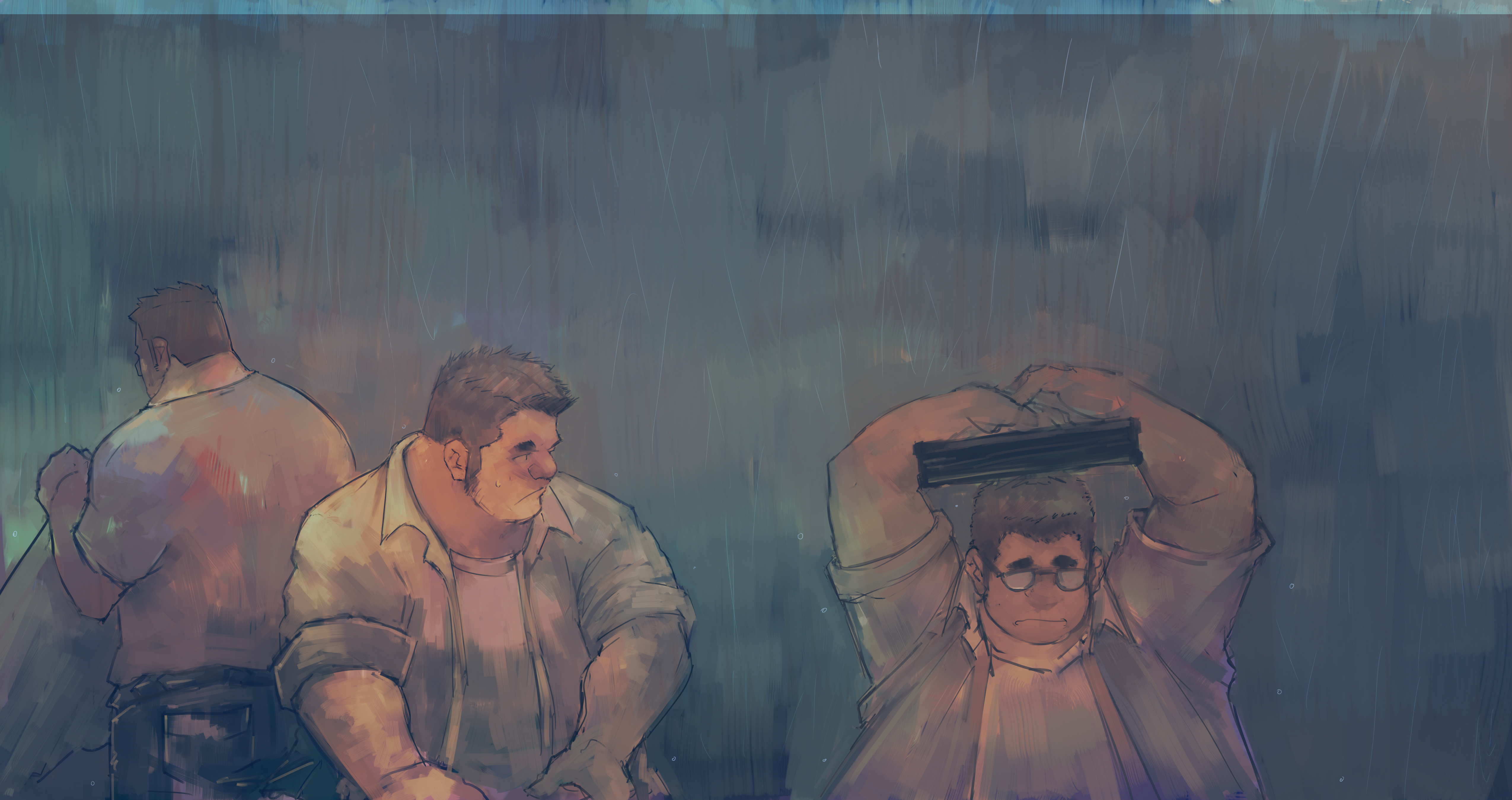 3boys absurdres arms_up bag bara collared_shirt covering_head dark denim fat fat_man glasses handbag highres jeans koto_(32456033) long_sideburns looking_at_another looking_to_the_side male_focus multiple_boys original pants pectorals profile rain shirt short_hair sideburns sleeves_rolled_up standing upper_body yaoi
