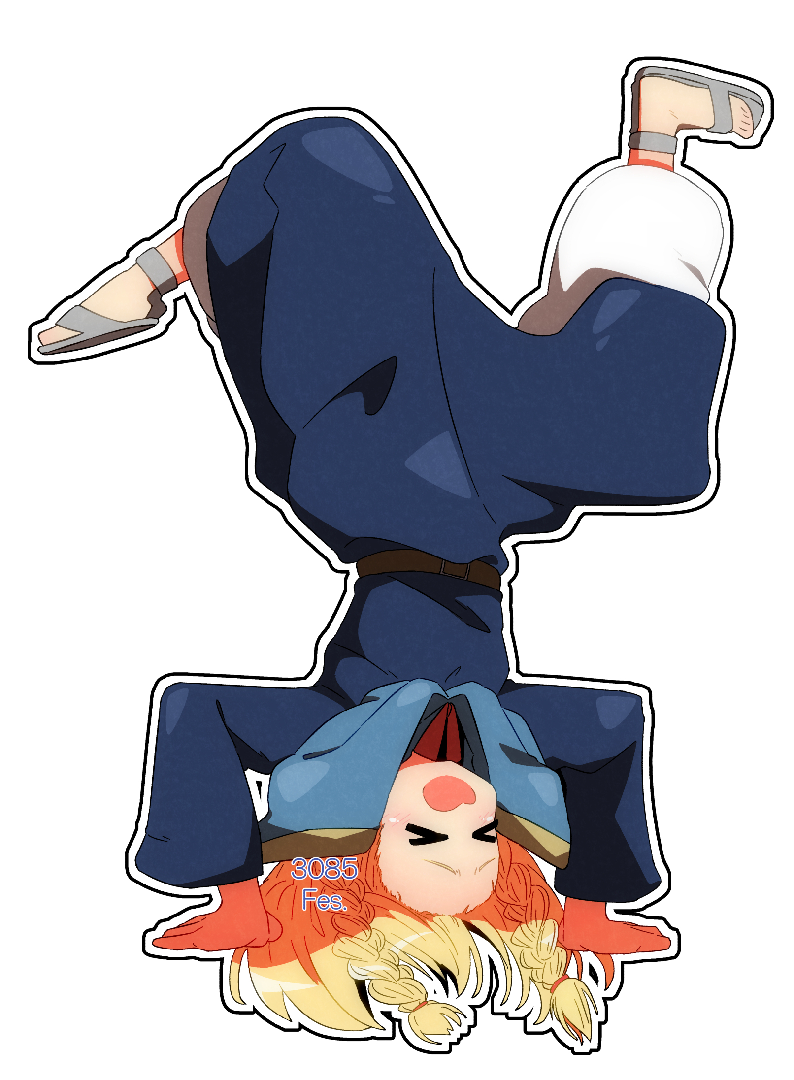 >_< 1girl 3085fes artist_name belt blonde_hair blue_robe braid closed_eyes dungeon_meshi full_body handstand highres long_hair long_sleeves marcille_donato open_mouth outline robe sandals simple_background solo twin_braids white_background