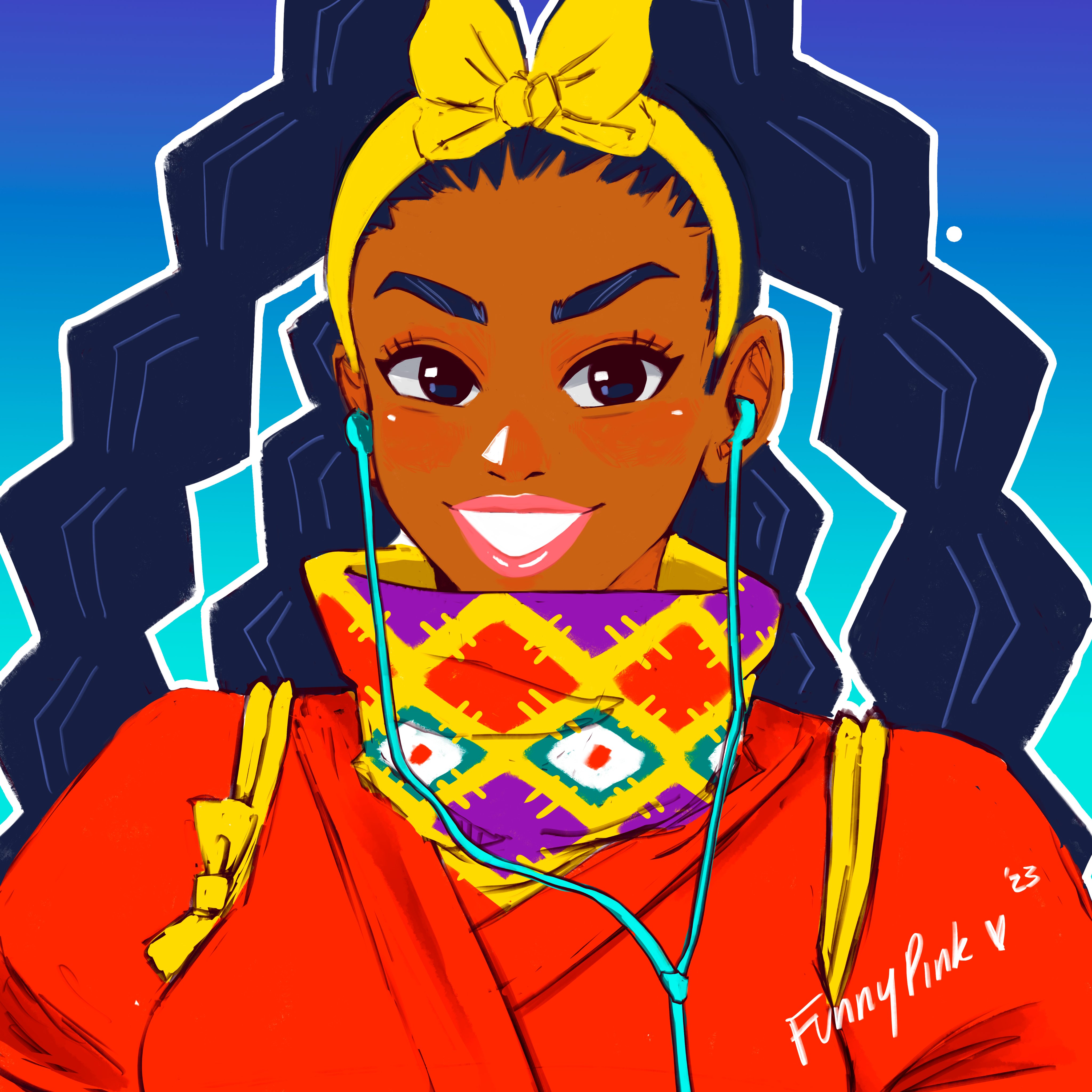 1girl absurdres black_hair blush capcom dark-skinned_female dark_skin forehead funnypink highres kimberly_jackson quad_braids ribbon scarf smile solo street_fighter street_fighter_6