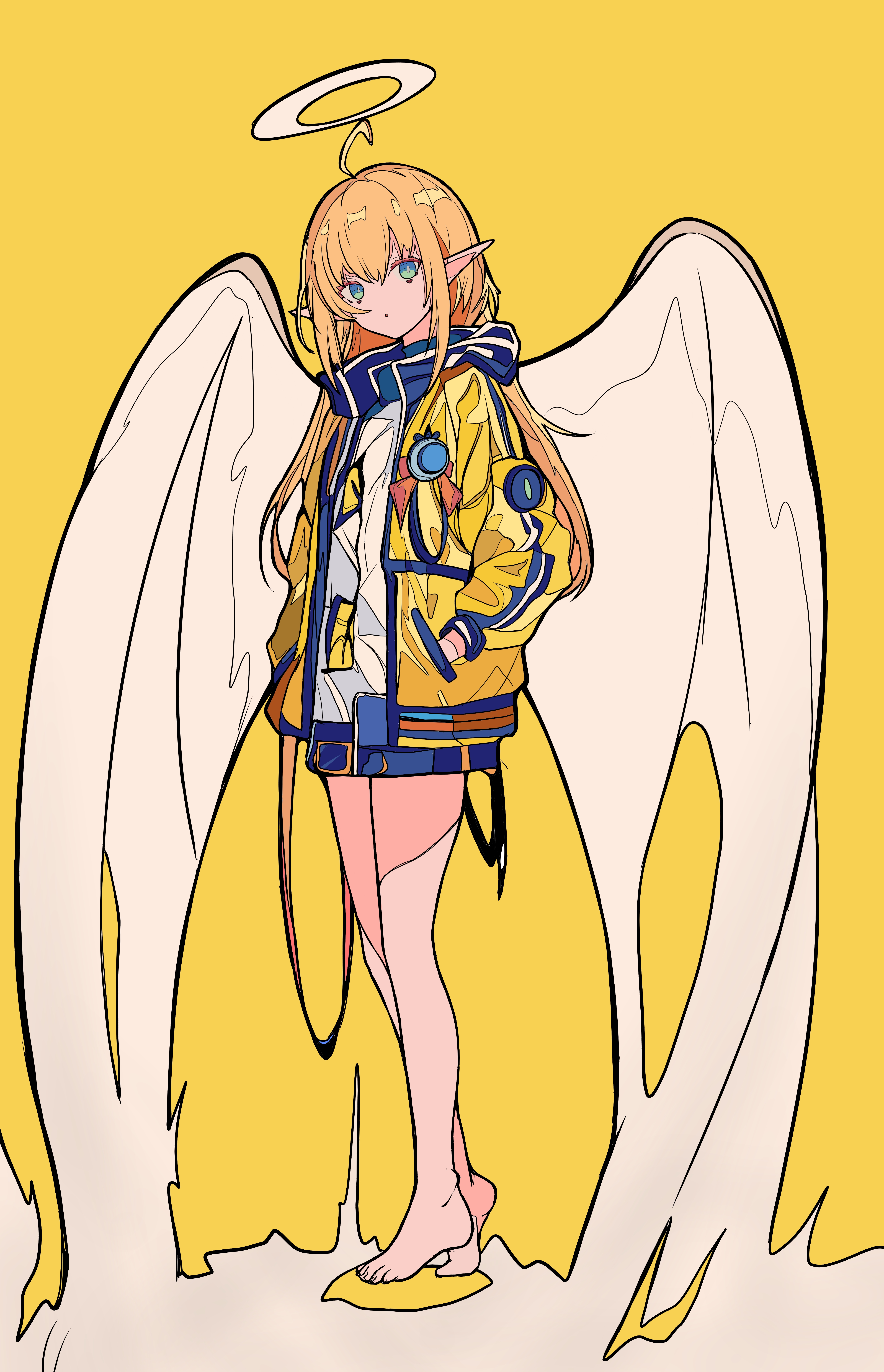 1girl absurdres angel_wings barefoot blonde_hair blue_skirt full_body green_eyes halo highres jacket long_hair long_sleeves looking_at_viewer miniskirt nanxiacheng1 open_mouth original pointy_ears shirt simple_background skirt solo white_halo white_shirt wings yellow_background yellow_jacket