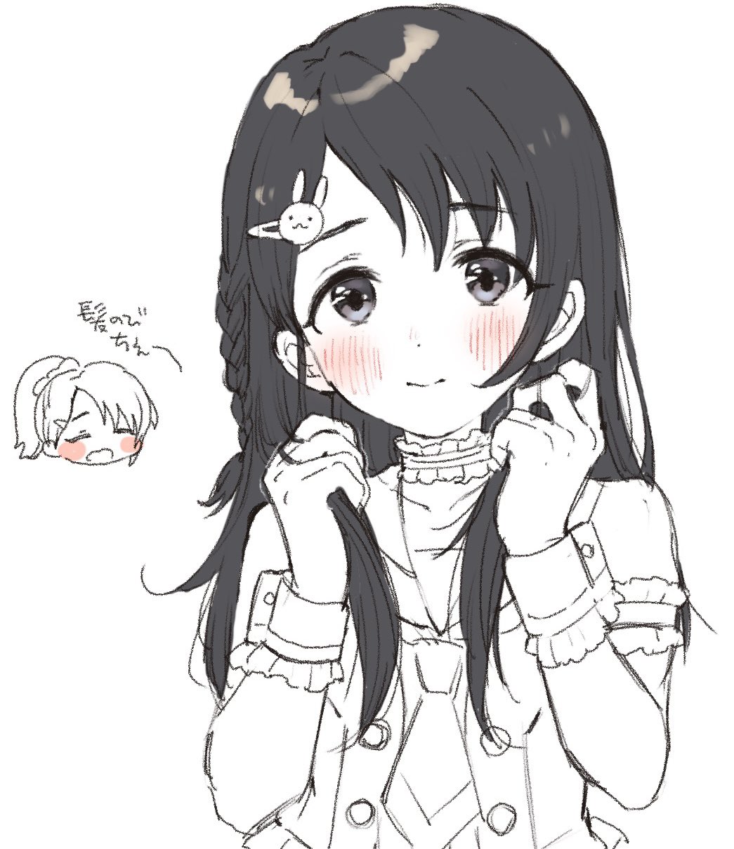 alternate_hair_length alternate_hairstyle armband black_hair blush blush_stickers braid buttons choker closed_mouth collarbone commentary_request disembodied_head dot_nose frilled_armband frilled_choker frilled_wrist_cuffs frills hair_ornament hairclip highres idolmaster idolmaster_cinderella_girls idolmaster_cinderella_girls_u149 long_hair looking_at_viewer monochrome nanagaedemo necktie open_mouth partially_colored playing_with_own_hair rabbit_hair_ornament sasaki_chie side_ponytail sidelocks translation_request upper_body vest white_background wrist_cuffs