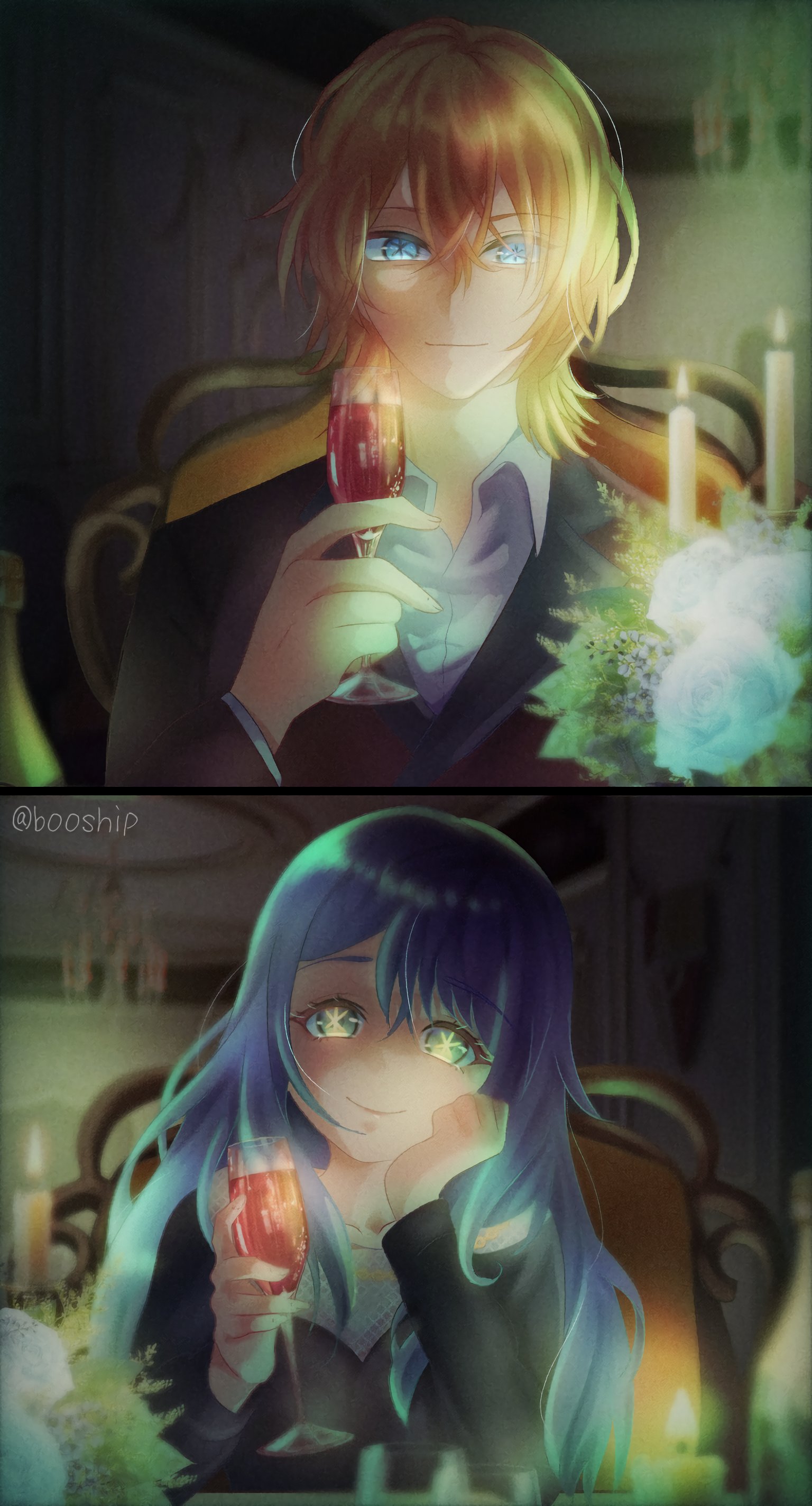 1boy 1girl absurdres blue_eyes blue_hair candlestand chair chandelier chromatic_aberration commentary flower formal_clothes glass green_eyes highres indoors kamiki_hikaru kurokawa_akane long_hair on_chair oshi_no_ko partially_unbuttoned rooks_(booship) rose star-shaped_pupils star_(symbol) suit symbol-shaped_pupils white_flower white_rose