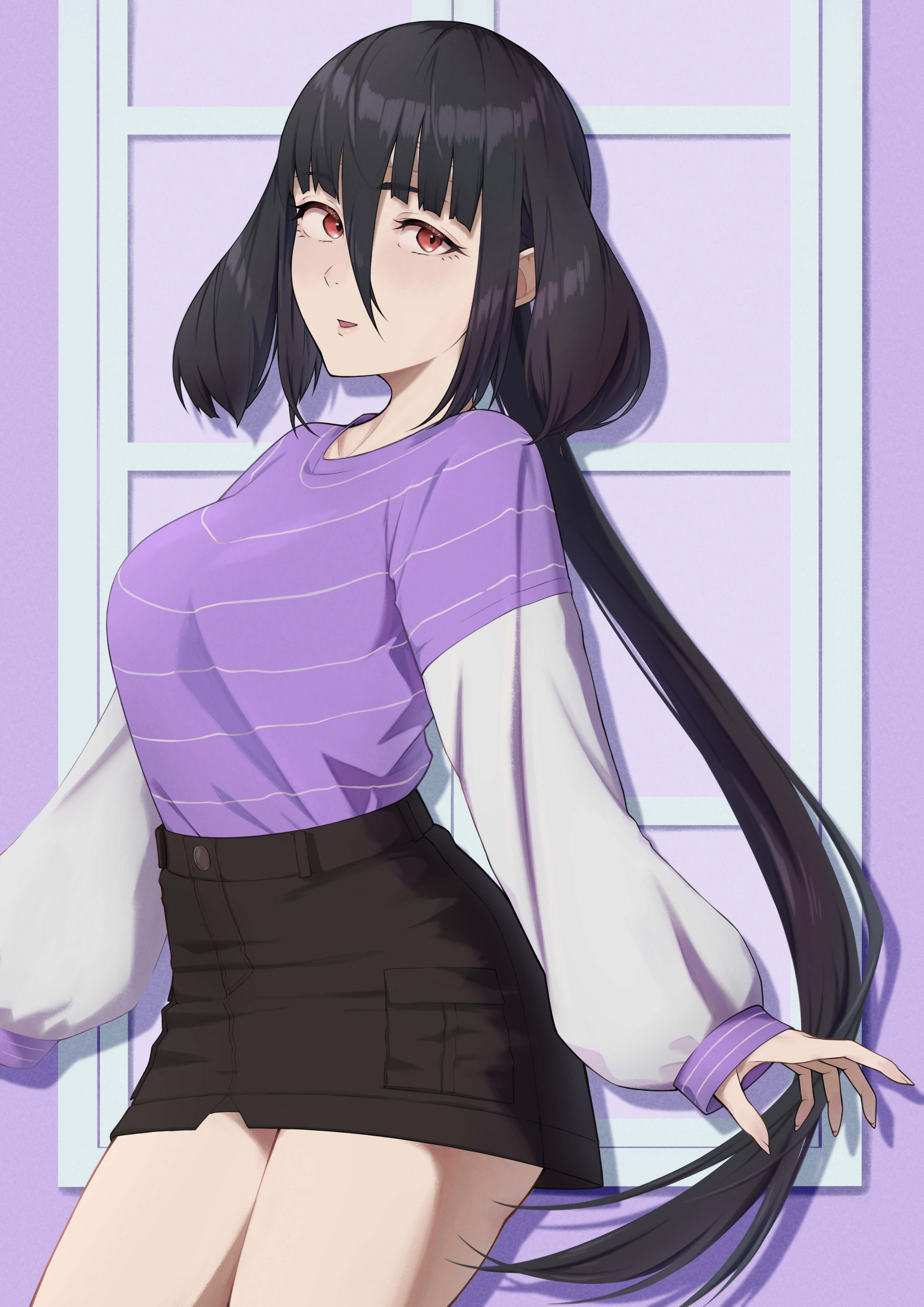 1girl absurdres alternate_costume bandaged_head bandages black_hair black_skirt fukayama_(0ppaityuki) hair_between_eyes highres long_hair long_sleeves purple_shirt red_eyes shirt sidelocks skirt solo striped_clothes striped_shirt white_sleeves yamada_tae zombie_land_saga