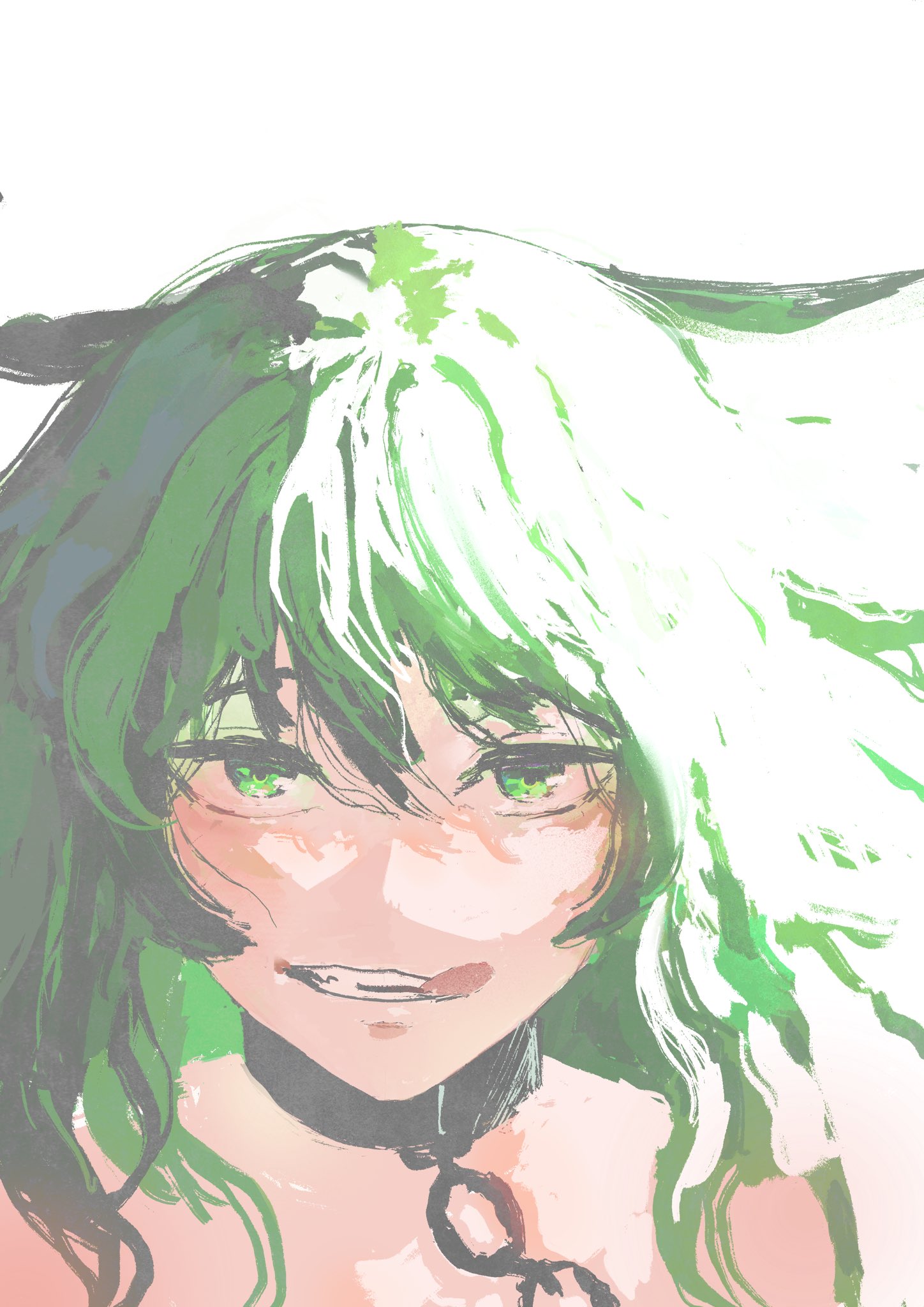 1girl black_souls black_souls_2 chain collar goddkilly green_eyes green_hair grin highres leaf_(black_souls) licking_lips long_hair looking_at_viewer medium_hair messy_hair metal_collar portrait simple_background smile solo tongue tongue_out white_background