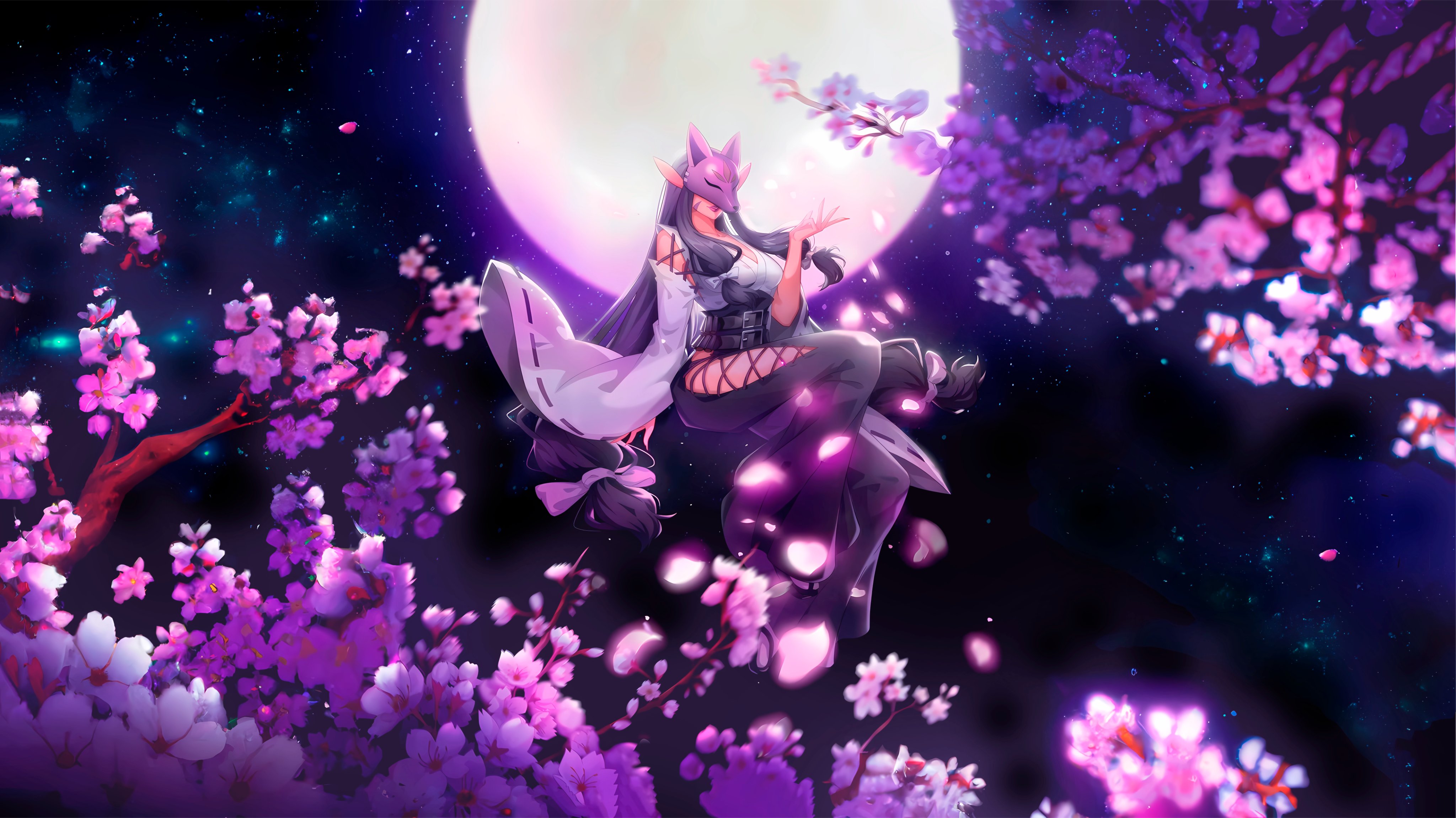 absurdres cherry_blossoms digimon digimon_(creature) flower fox_mask full_moon highres japanese_clothes kimono kuzuhamon kuzuhamon_miko_mode lipstick long_hair makeup mask miko moon night